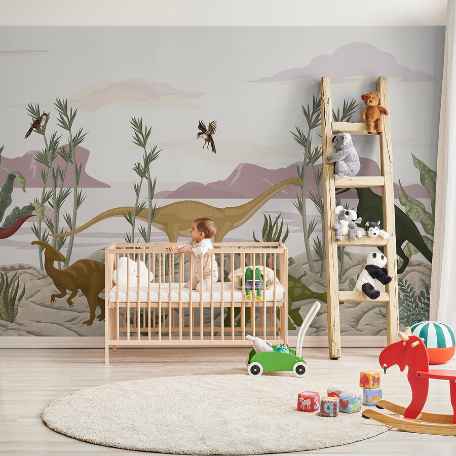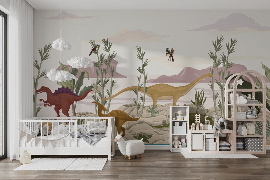 Transformeer elke ruimte met deze levendige muurschildering met een levendige groep dinosaurussen die een woestijnlandschap verkennen. Stel je voor dat je een kamer binnenloopt waar vriendelijke reuzen zoals de zachtaardige Brachiosaurus en de nieuwsgierige Stegosaurus tot leven lijken te komen op je muren. De zachte aardetinten en het speelse groen zorgen voor een rustige en toch spannende sfeer. Het is de perfecte gespreksstarter – kinderen zullen graag hun favorieten aanwijzen terwijl ze stiekem dromen over prehistorische avonturen. Of het nu in een speelkamer of een gezellig hoekje is, deze muurschildering neemt je mee naar een wereld waar dinosaurussen gedijen. Wie wil er nu niet een beetje dino-magie in zijn kamer?
