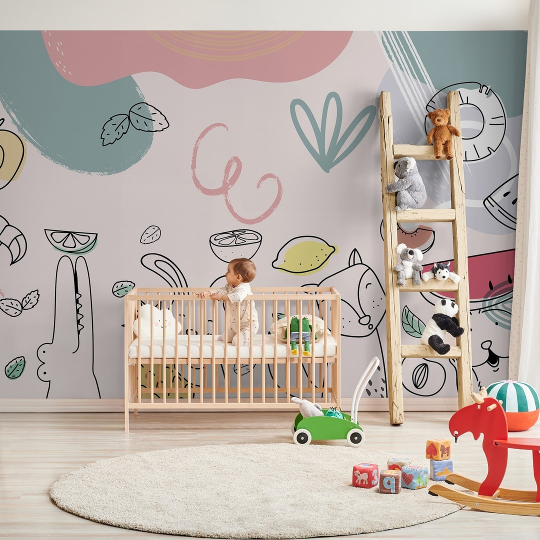 Fleur elke kamer op met deze prachtige muurschildering met cartooneske dieren die vrolijk hun favoriete fruit vasthouden. Stel je een brutale flamingo voor die geniet van een stuk watermeloen of een konijntje dat een hele ananas vasthoudt – het is net een fruitfeestje op je muur! Dit grillige ontwerp geeft een speelse sfeer, perfect voor een kinderkamer of een gezellig hoekje. Stel je voor dat je binnenkomt en je meteen lichter voelt, alsof je een zonnige dag aan het strand bent binnengestapt. Het is een vleugje plezier en kleur dat misschien wel een fruitsalade in de hand werkt. Wie zou er niet tussen deze fruitige vrienden willen wonen?