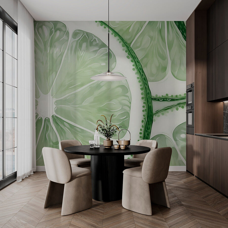Breng een pittige sfeer in je interieur met deze charmante muurschildering van op elkaar gestapelde schijfjes verse limoen. Het is helder, speels en precies wat je nodig hebt om een keuken of eethoek op te fleuren. Stel je voor dat je een etentje organiseert – het is de setting voor lachen, lekker eten en misschien zelfs een paar margarita’s. Het levendige groen en de ingewikkelde details geven je het gevoel alsof je zo een fruitmarkt binnenstapt. En limoenen hebben iets verfrissends; ze geven energie zonder overweldigend te zijn. Perfect voor iedereen die gelooft in de kracht van een vrolijke sfeer. Geniet van de uitbarsting van creativiteit die deze muurschildering met zich meebrengt en zie hoe je muren veranderen in een levendige gespreksstarter.