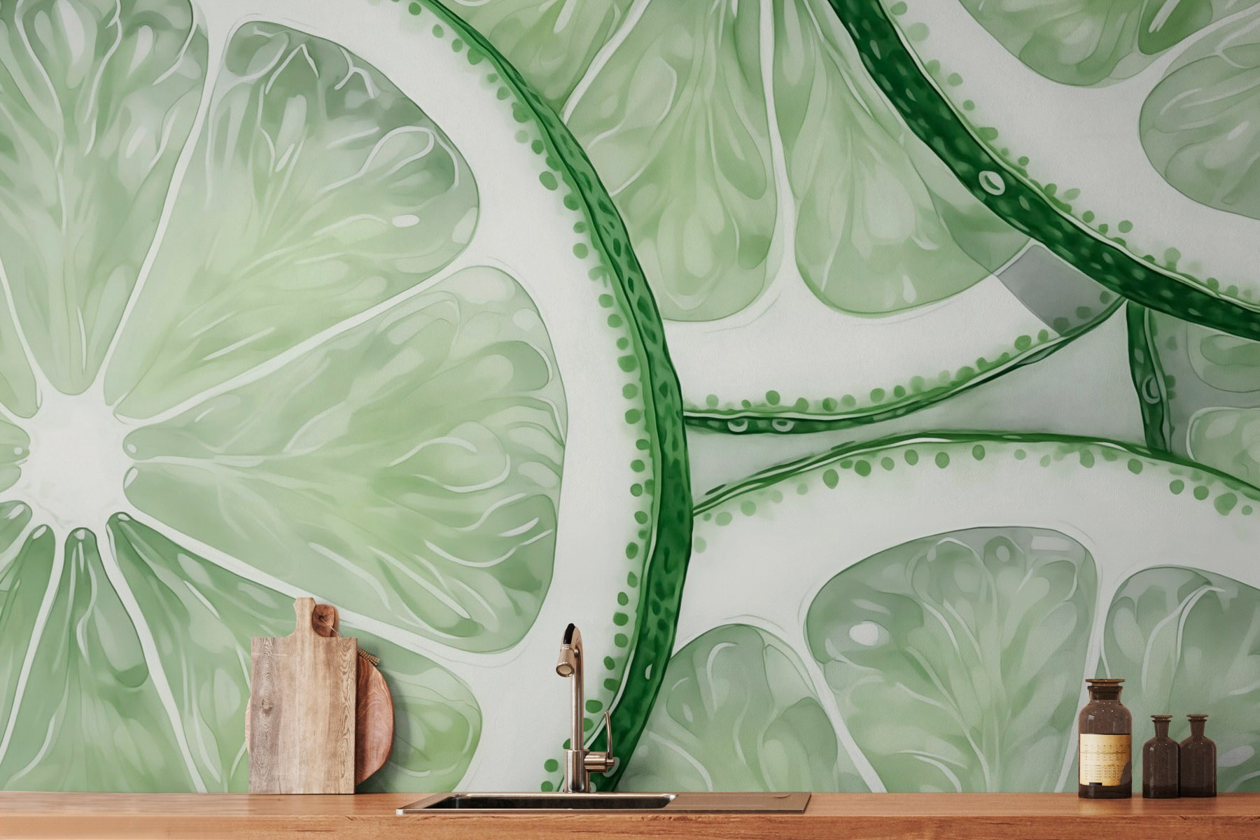 Breng een pittige sfeer in je interieur met deze charmante muurschildering van op elkaar gestapelde schijfjes verse limoen. Het is helder, speels en precies wat je nodig hebt om een keuken of eethoek op te fleuren. Stel je voor dat je een etentje organiseert – het is de setting voor lachen, lekker eten en misschien zelfs een paar margarita’s. Het levendige groen en de ingewikkelde details geven je het gevoel alsof je zo een fruitmarkt binnenstapt. En limoenen hebben iets verfrissends; ze geven energie zonder overweldigend te zijn. Perfect voor iedereen die gelooft in de kracht van een vrolijke sfeer. Geniet van de uitbarsting van creativiteit die deze muurschildering met zich meebrengt en zie hoe je muren veranderen in een levendige gespreksstarter.