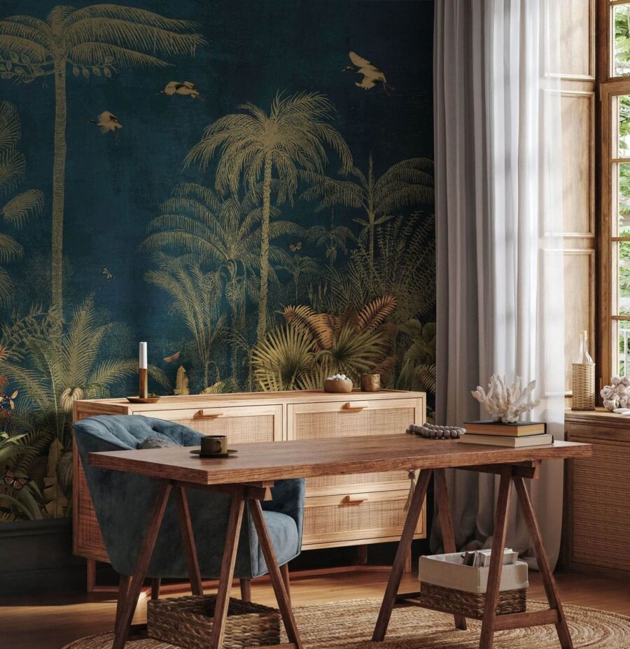 Transformeer uw ruimte met deze prachtige muurschildering, waarop weelderige palmbomen en vrolijke vogels tot leven komen tegen een dromerige achtergrond. Stel je voor dat je een kamer binnenloopt die aanvoelt als een tropisch toevluchtsoord – serieus, wie heeft er nog vakantie nodig met deze schoonheid aan de muur? De rijke tinten en gedetailleerde details creëren een rustgevende sfeer, perfect voor een gezellig leeshoekje of om een saaie muur op te fleuren. Het is alsof je een stukje natuur in huis haalt, maar dan zonder de muggenbeten. Vrienden zullen zich afvragen of je een dure binnenhuisarchitect hebt ingehuurd – ze hebben geen idee dat het gewoon deze muurschildering is die voor de magie zorgt!