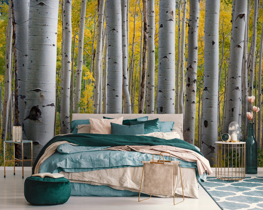 Een ruimte transformeren? Deze muurschildering van een groep witte bomen met hun mooie gele bladeren is alsof je een stukje natuur aan je muur hebt hangen. Stel je voor dat je een kamer binnenloopt en meteen die serene sfeer voelt, alsof je een vredige boswandeling maakt zonder ooit je huis te verlaten. De hoge, elegante bomen lijken toe te kijken en creëren een zachte achtergrond die warmte en een vleugje kleur brengt. Perfect voor die gezellige hoekjes of zelfs die saaie kantoorruimte die wat leven nodig heeft. Je krijgt zin om een kopje thee in te schenken, een goed boek te pakken en gewoon van het uitzicht te genieten. Wie wist dat muren zo’n gezellige uitstraling konden hebben?
