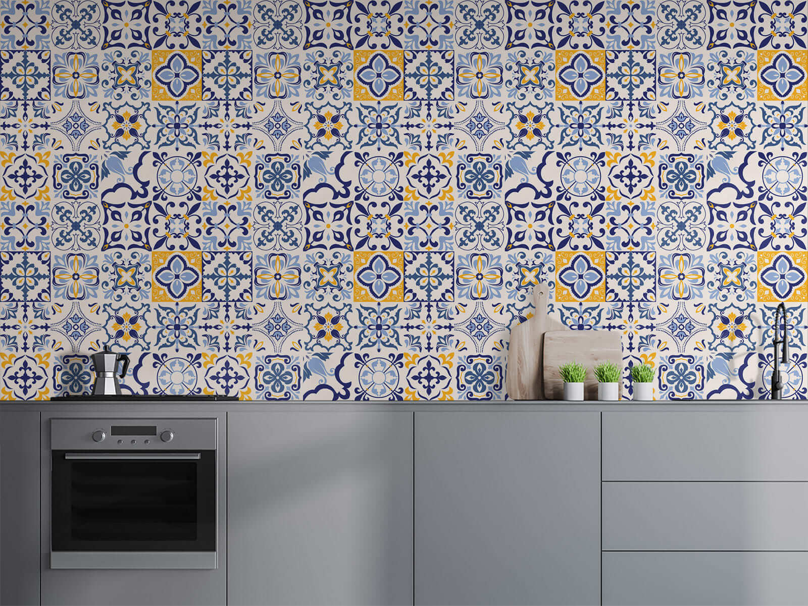 Transformeer uw ruimte met deze levendige muurschildering met een prachtig patroon van blauwe en gele tegels. Het is alsof u een stukje mediterrane charme in huis haalt. Stel u voor dat u weer in een gezellig café in Spanje zit, genietend van een kopje koffie terwijl u de prachtige ontwerpen om u heen in u opneemt. De geometrische vormen dansen over uw muur en voegen een speels tintje toe dat elke keer dat u erlangs loopt vreugde opwekt. Het is perfect om een saaie kamer op te fleuren of een levendige achtergrond te creëren voor uw volgende bijeenkomst. Stel je voor dat je vrienden je smaak bewonderen terwijl je stiekem geniet van je fantastische decorkeuze. Waarom zou je genoegen nemen met saaie muren als je een kunstwerk kunt hebben dat leeft?