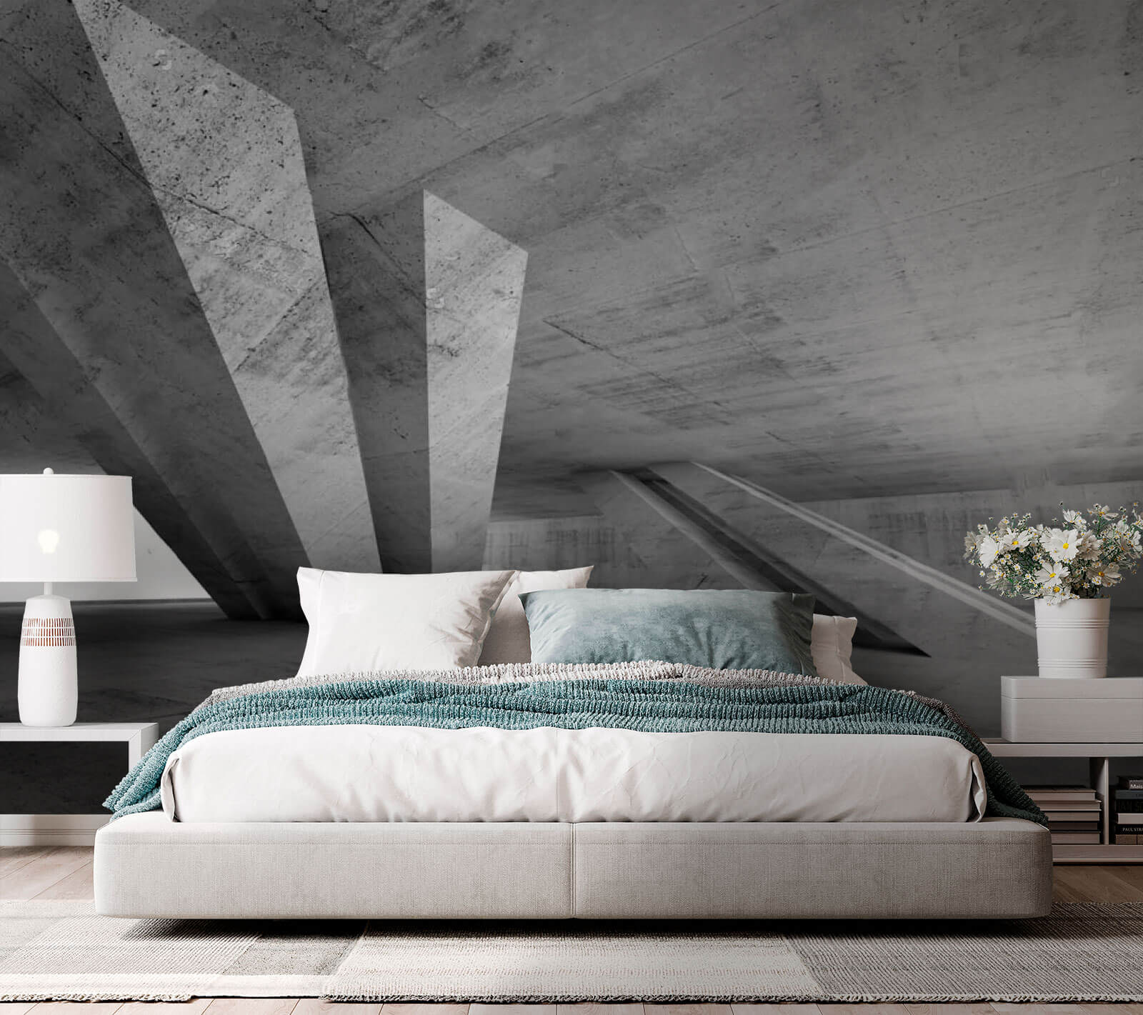 Verander uw ruimte in een chique stedelijke oase met deze prachtige muurschildering ‘Concrete Room with Columns’. Stel u voor dat u vanuit uw woonkamer een strakke, eigentijdse omgeving binnenstapt. De gedurfde geometrische vormen en gladde texturen zorgen voor een vleugje moderne elegantie, waardoor iedereen het gevoel krijgt dat hij of zij net een chique galerie is binnengestapt.