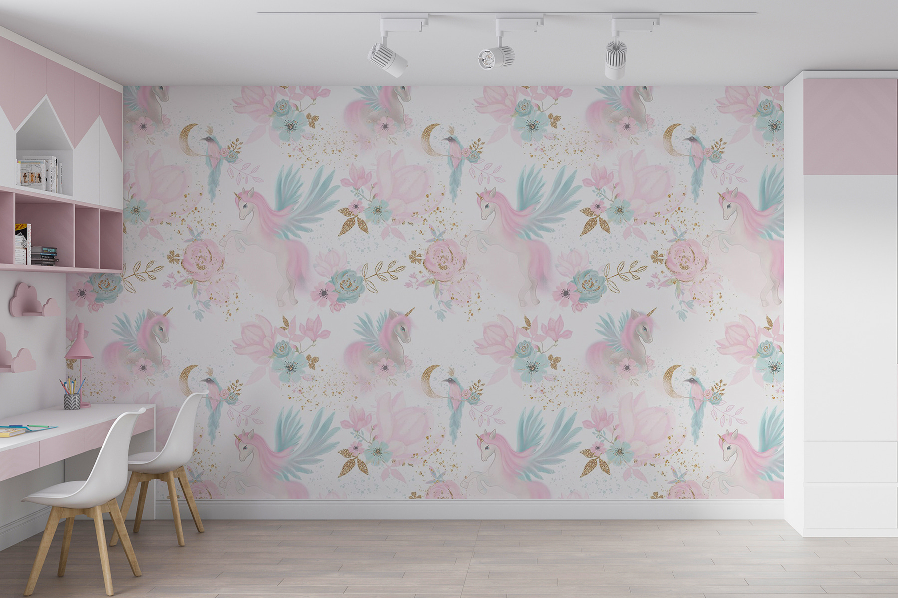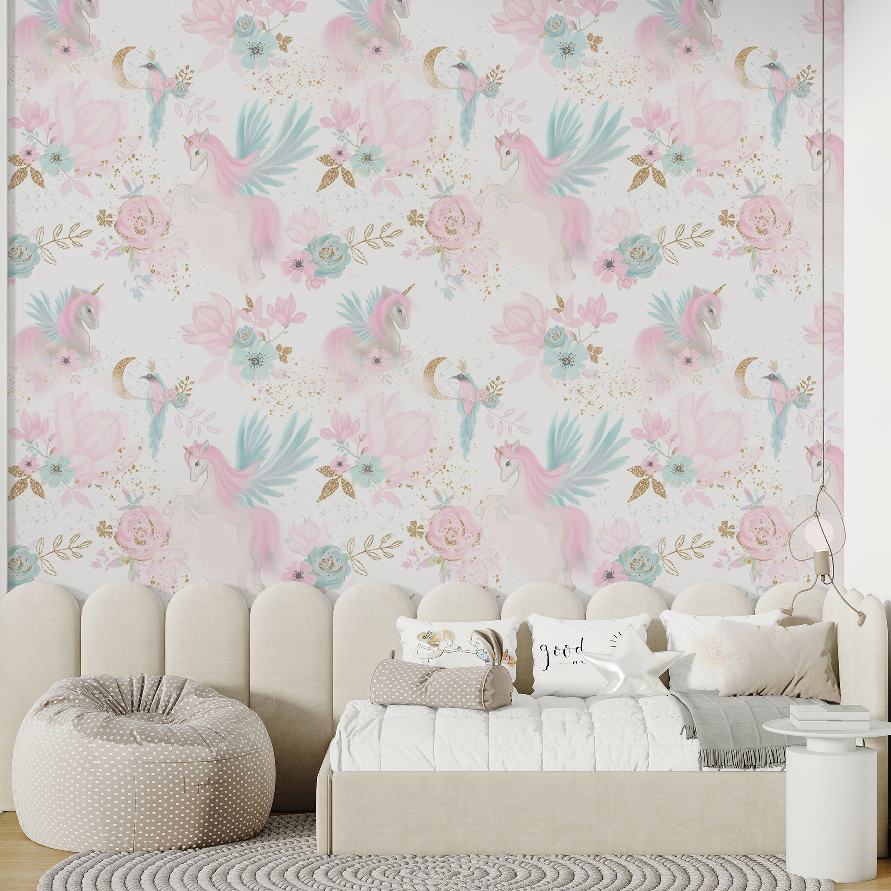 Een kamer omtoveren in een grillig wonderland is net zo eenvoudig als een rolletje van deze muurschildering met vrolijke eenhoorns te midden van pastelkleurige bloemen. Stel je voor: een saaie muur die plotseling tot leven komt en een glimlach ontlokt aan zowel kinderen als volwassenen. De zachte tinten creëren een dromerige sfeer, perfect om te spelen of gewoon te dagdromen. Stel je voor dat je een boek leest in deze magische omgeving, waar elke blik is alsof je een sprookje binnenstapt. Voeg een vleugje fantasie toe en je hebt een ruimte die warm en uitnodigend aanvoelt, waar achter elke hoek avonturen wachten.