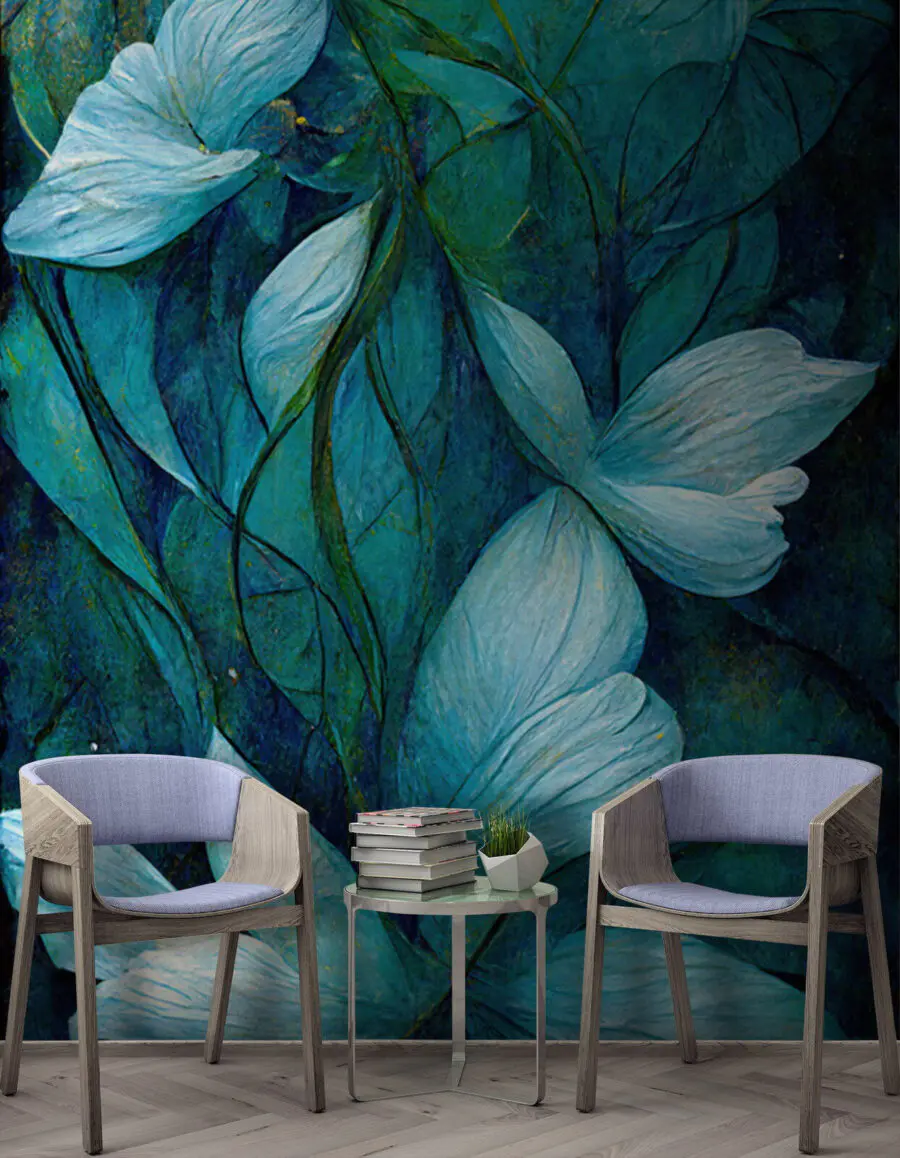 Deze muurschildering, “Schilderij van bloemen en bladeren”, is als een frisse wind voor elke kamer. Stel je voor dat je in een grillige tuin stapt telkens als je je kamer binnenloopt. De koele blauwtinten en tere bloemblaadjes voelen bijna levend aan en wiegen zachtjes in een briesje. Het is perfect om een vleugje natuur binnenshuis te brengen, zonder water te geven!