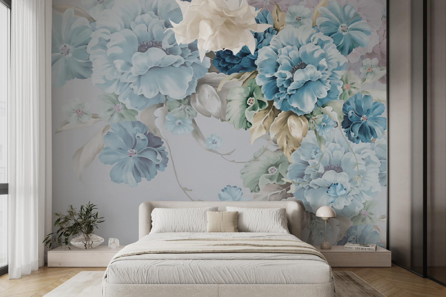 Transformeer je ruimte met “Pastel Blossoms”, een muurschildering die bijna uitnodigt tot vreugde in je kamer. Stel je voor dat je een ruimte binnenloopt waar zacht blauw en zacht groen zich vermengen als oude vrienden en een sfeer creëren die zowel verfrissend als sereen aanvoelt. Deze prachtig bewerkte bloemen zijn een lust voor het oog – elk bloemblaadje lijkt verhalen te fluisteren over de lente en een nieuw begin. Ze zijn perfect voor een woonkamer of een gezellig hoekje en kunnen inspiratie opwekken of gewoon een glimlach op je gezicht toveren op een zware dag. Het is net alsof je een tuin hebt, maar dan zonder het water geven en onkruid wieden! Stel je voor dat je lekker wegkruipt met een goed boek, genietend van de schoonheid van dit alles. Een vleugje charme, een beetje kleur en boem-je muur is een meesterwerk.