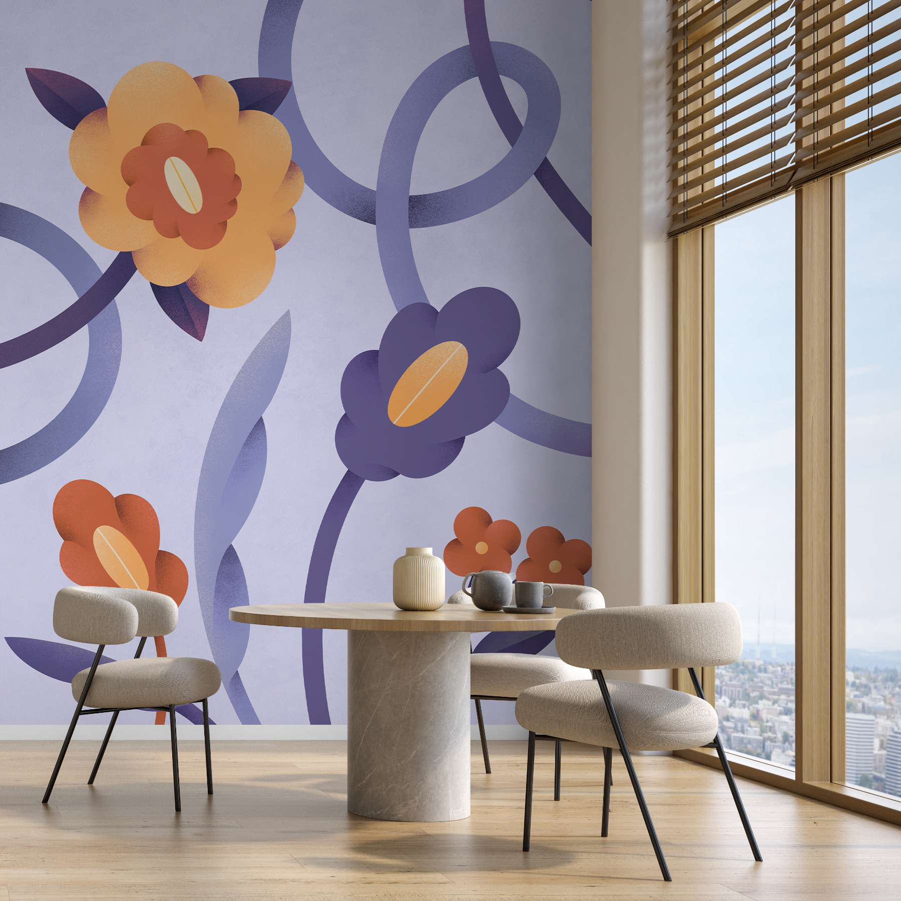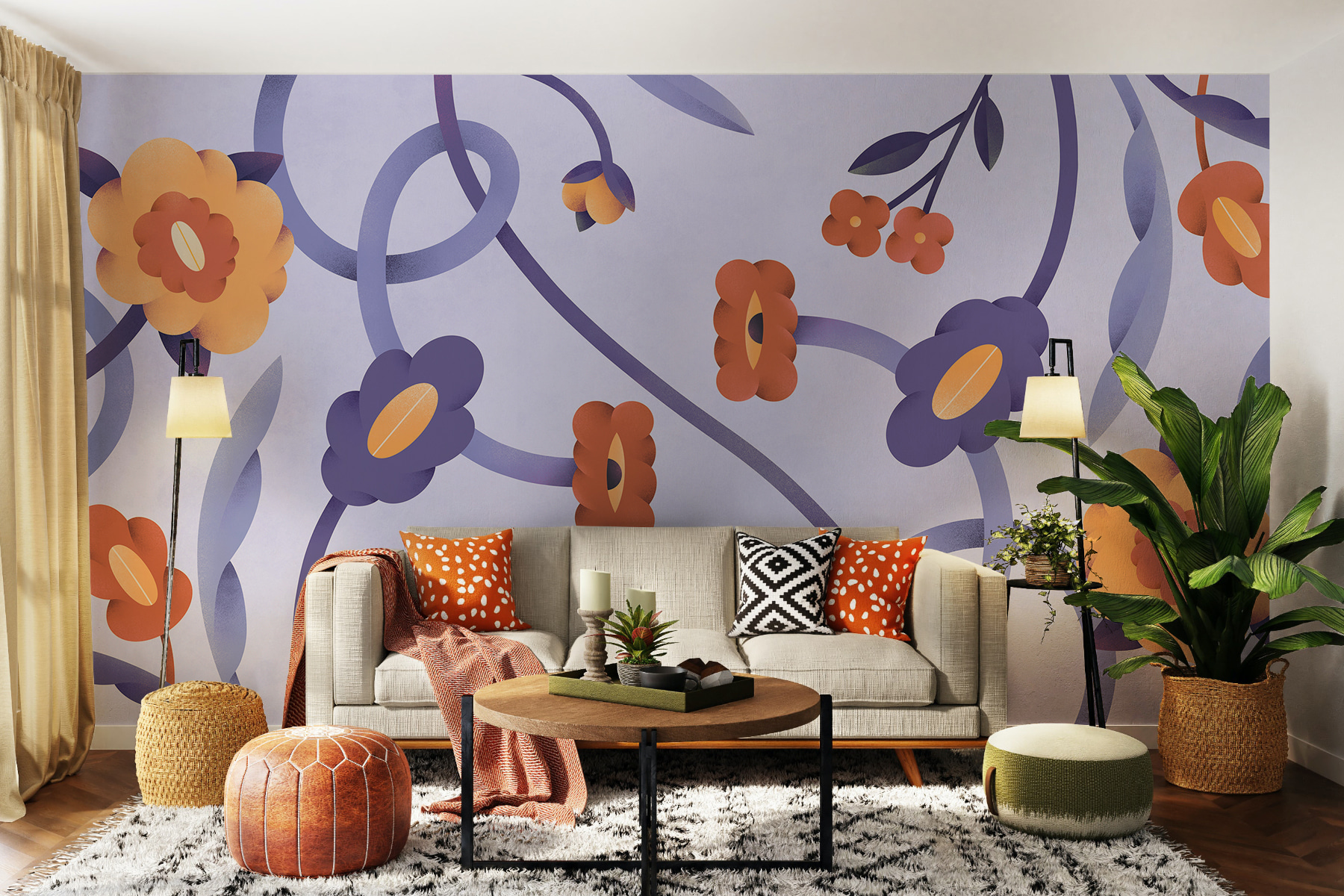 “Muurschilderingen Paarse en oranje bloemen en wijnranken” is alsof je een vrolijke, dromerige tuin binnenstapt. Die verstrengelde wijnranken en bloesems in fel paars en zonnig oranje barsten gewoon van de energie. Stel je voor dat je wakker wordt met dit levendige tafereel – een onmiddellijke oppepper! Het is alsof je een vleugje zomer aan je muur hebt hangen, ongeacht het seizoen.