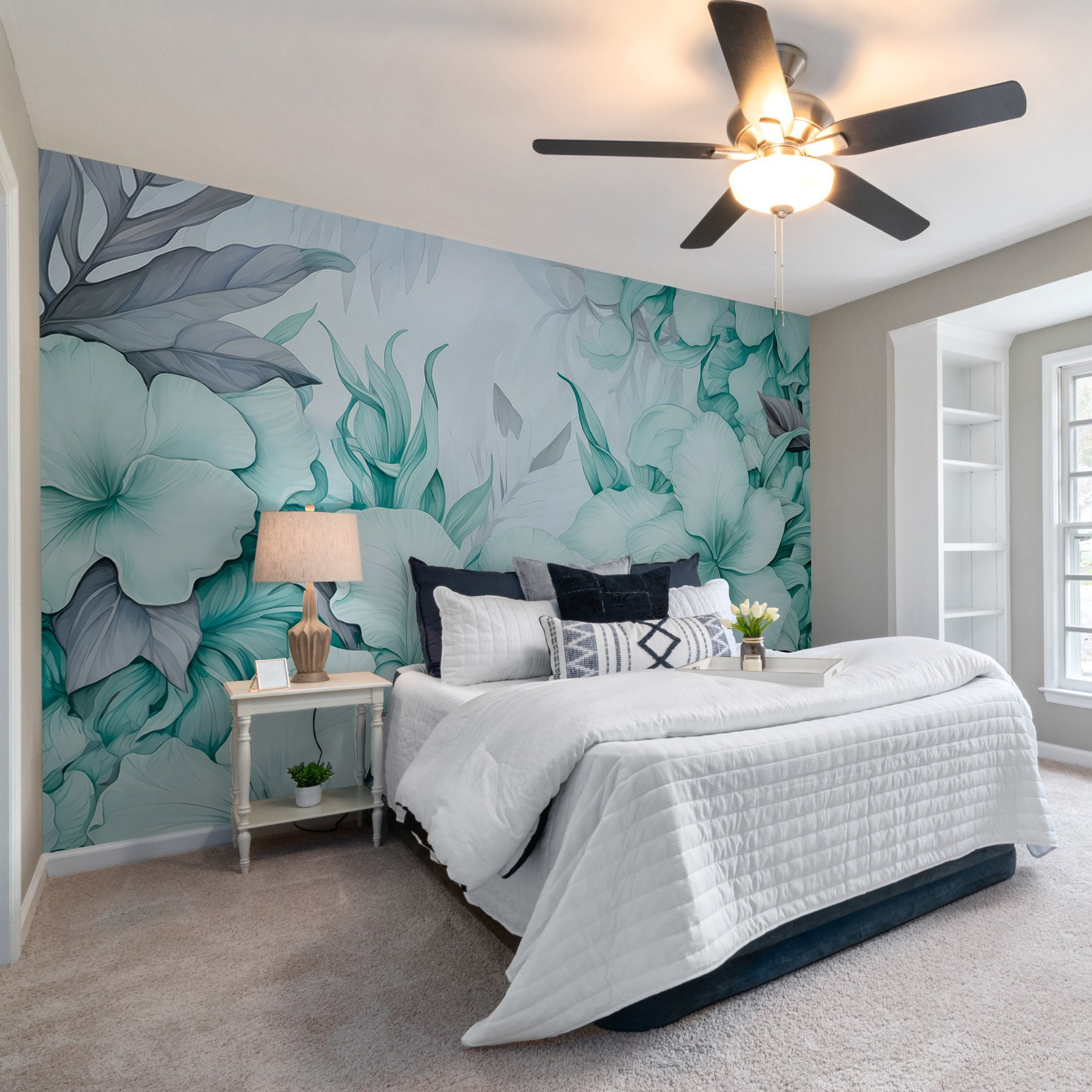 Transformeer elke ruimte met deze prachtige muurschildering met delicaat groen en grijs gebladerte. Stel je voor dat je een weelderig botanisch wonderland binnenstapt zonder je huis te verlaten – het is alsof je buiten naar binnen haalt! Deze muurschildering vormt een serene achtergrond, perfect voor woon- of slaapkamers waar ontspanning heerst. De zachte tinten versmelten moeiteloos en creëren een vredige sfeer. Of het nu dient om een gesprek op gang te brengen of om te kalmeren, er zal zeker een glimlach op je gezicht verschijnen. Stel je een knus hoekje voor met deze schoonheid; het zou zomaar je nieuwe favoriete hoekje in huis kunnen worden. Voeg vandaag nog een vleugje charme van de natuur toe!