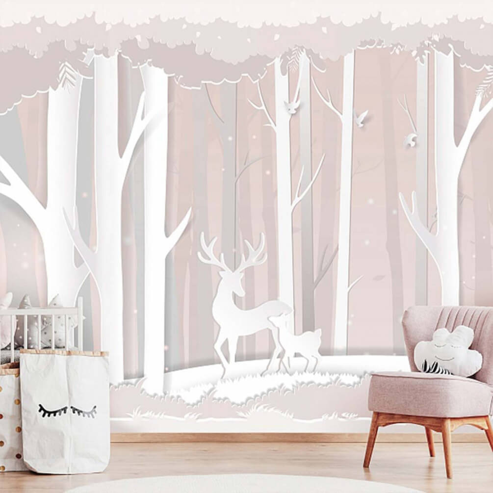 Imagine stepping into a serene woodland every time you walk into the room. This mural, with its delicate paper-cut style deer roaming a tranquil forest, gives off a vibe that’s both cozy and sophisticated. It’s like bringing a piece of nature indoors, minus the actual dirt (thank goodness). The soft colors evoke calmness—perfect for creating a peaceful reading nook or a dreamy bedroom. Picture sipping tea while gazing at these gentle creatures. Who wouldn’t feel a bit enchanted? It’s nature’s charm, minus the mosquitoes, making every glance a mini escape. A true conversation starter!