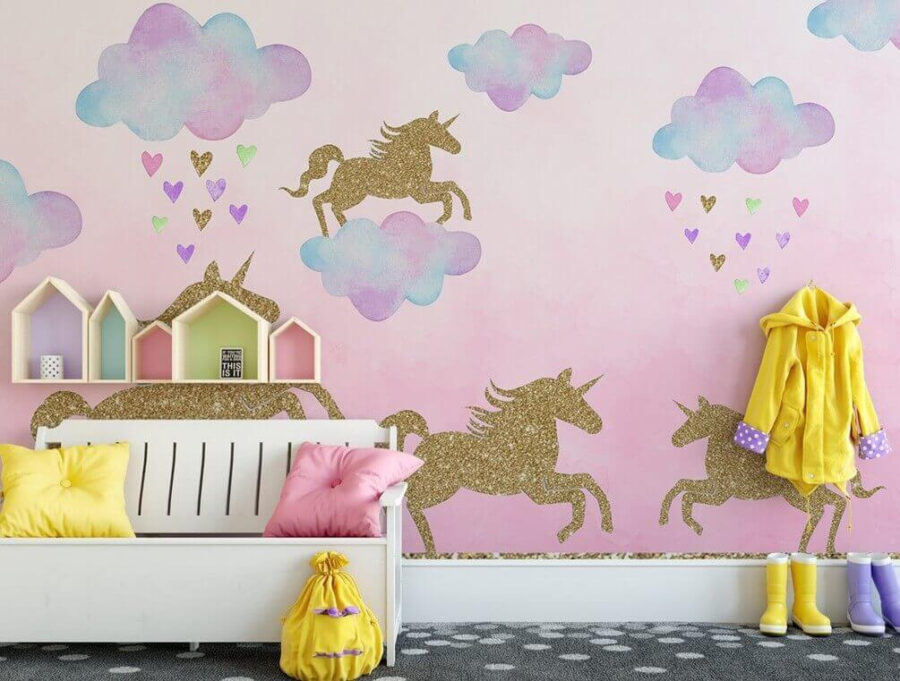 Verander elke kamer in een sprookjesachtig paradijs met deze betoverende muurschildering. Met speelse eenhoorns die tussen de wolken dartelen en hartjes verspreiden, brengt het een luchtige sfeer die het dagelijks leven een beetje magischer maakt. Stel je voor dat je wakker wordt met dit vrolijke tafereel – het is alsof je de gordijnen opent en in een droom terechtkomt! Perfect voor een kinderkamer of een creatieve ruimte, het stimuleert de verbeelding en vreugde. Bovendien zorgen de glinsterende eenhoorns voor net genoeg sprankeling om iedereen te laten glimlachen. Wie wil er nu geen vleugje fantasie? Het is niet alleen decoratie, het is een dagelijkse dosis plezier!