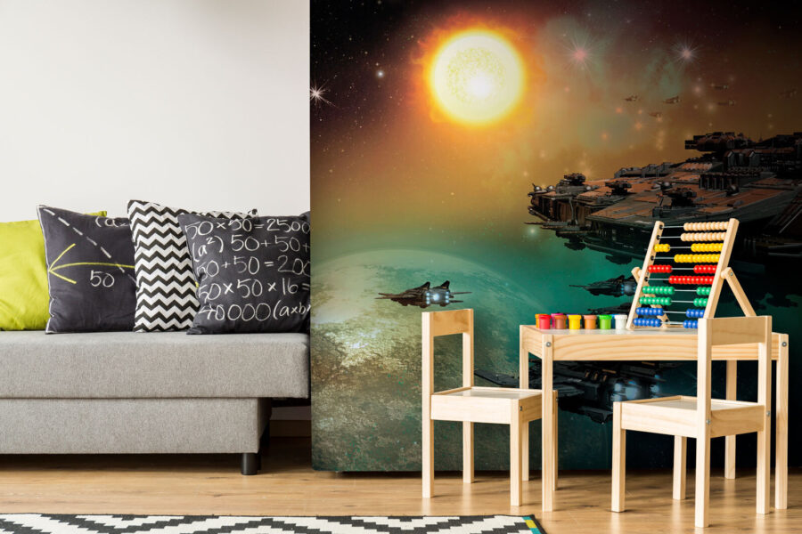 De gedetailleerde sterrenschepen, de gloeiende zon en de verre planeten geven de kamer het gevoel alsof je zo uit een sciencefictionfilm komt. Het heeft een magische uitstraling waardoor je dagdroomt over sterrenstelsels ver, ver weg. Bovendien is het veel cooler dan naar een gewone muur te staren, toch? Je kunt bijna het gezoem van de motoren horen en de sensatie van ruimteverkenning voelen. Serieus, het zou je wel eens kunnen inspireren om astronaut te worden… of in ieder geval om je favoriete ruimtefilms opnieuw te bekijken. Voeg een beetje van het universum toe aan je dagelijkse leven – breng de sterren thuis!