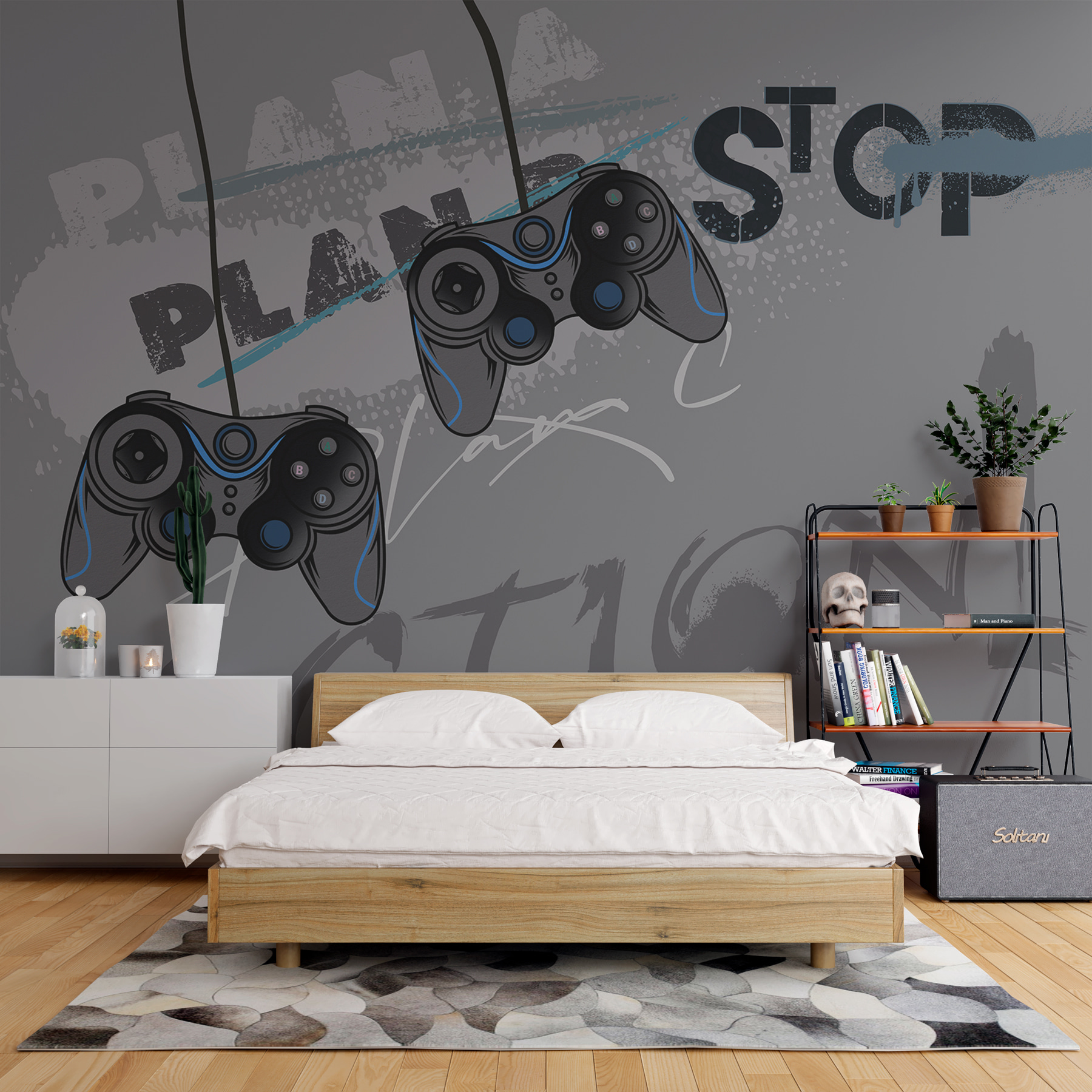 Tover elke kamer om in een levendig gamingparadijs met deze muurschildering met opvallende videogamecontrollers tegen een strakke grijze achtergrond. Het is niet zomaar een ontwerp; het is een oproep tot actie voor al die late gamesessies en epische overwinningen. Stel je dit eens voor: een gezellige ruimte waar vrienden samenkomen, snacks binnen handbereik, gelach in de lucht en ogen gericht op het scherm – deze muurschildering zet de perfecte toon. De speelse “PLAN” en “STOP” kunst combineert plezier en energie en herinnert iedereen eraan dat elk moment telt, zowel in de game als daarbuiten. Het is ideaal voor een gameruimte, de slaapkamer van een jonge speler of zelfs een leuke leefruimte. Dus waarom niet die gamer spirit omarmen?