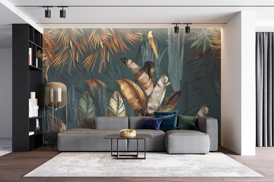 Stel je voor dat je een kamer binnenloopt en meteen wordt meegevoerd naar een weelderige, levendige jungle – klinkt dromerig, toch? Deze “Tropical Foliage in Vibrant Hues” muurschildering doet precies dat! Het is net een mini-vakantie voor je ogen. Met die felle groentinten en warme sinaasappels voelt je ruimte levendig aan, barstensvol energie.