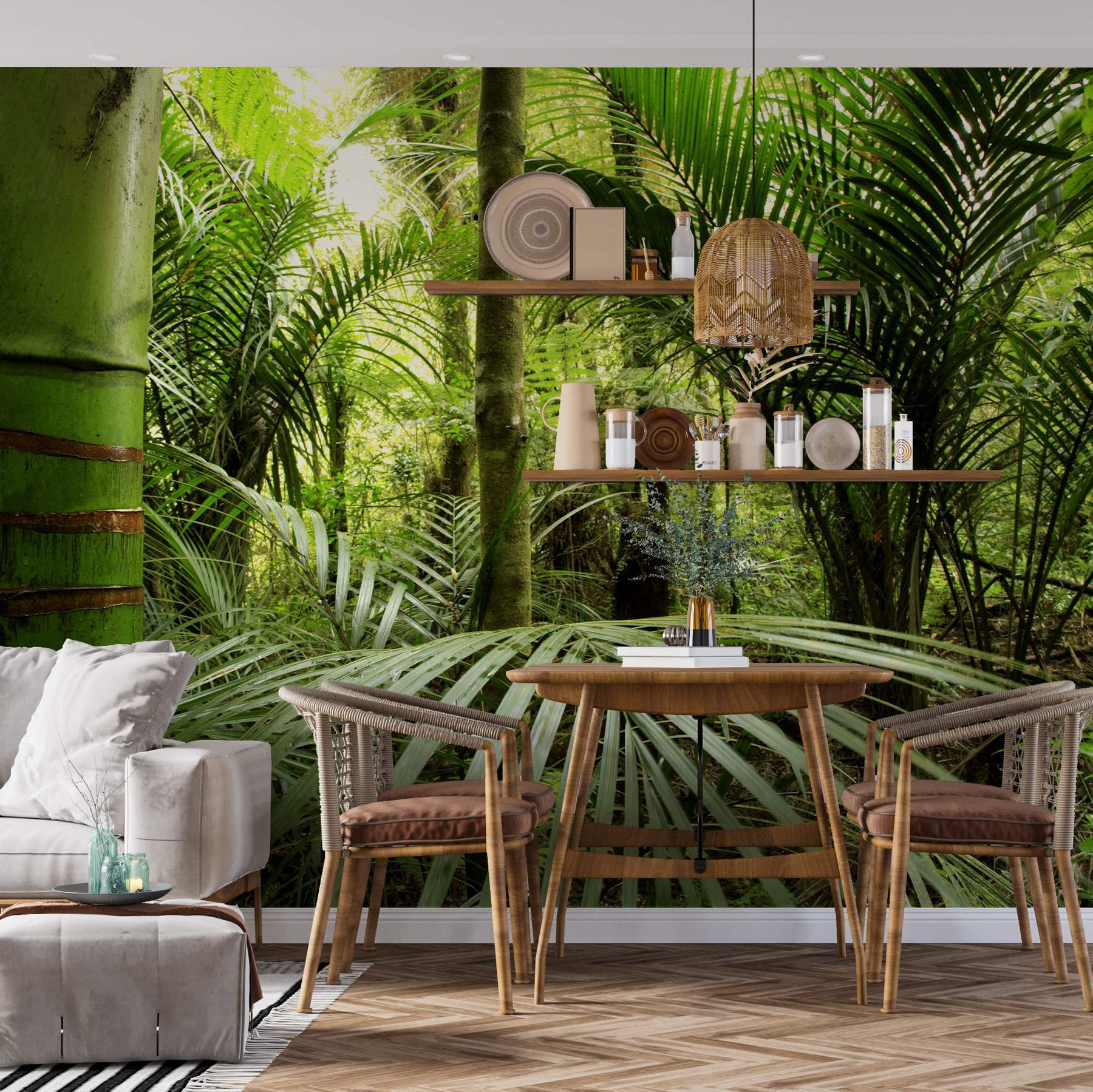 Heb je er ooit van gedroomd om te ontsnappen naar een weelderig groen paradijs zonder je woonkamer te verlaten? Met deze muurschildering van een weelderige groene jungle met palmbomen is dat precies wat je nodig hebt. Het is alsof je een geheime tuin binnenstapt, zonder dat je een paspoort nodig hebt. Stel je voor dat je ‘s ochtends aan je koffie nipt en het gevoel hebt dat je op een exotische vakantie bent. Het groen is zo levendig dat je het geritsel van de bladeren en het getjilp van de vogels bijna hoort. Perfect om in elke kamer een vredig, op de natuur geïnspireerd toevluchtsoord te creëren. Geef je kamer de sfeer van de jungle – een verrekijker is niet nodig.