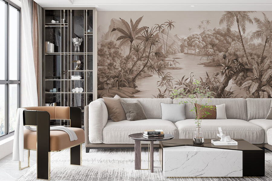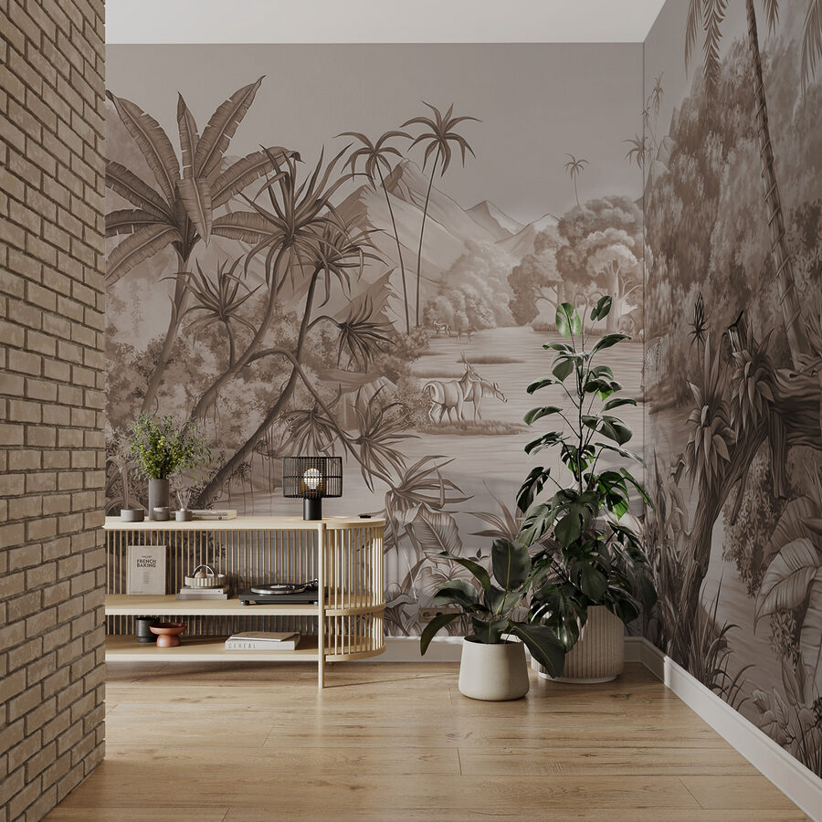 Tover elke kamer om in een tropische ontsnapping met deze prachtige muurschildering met een levendige junglescène. Zie jezelf al liggen met de geluiden van de natuur om je heen, terwijl sierlijke dieren door het weelderige gebladerte slingeren. De aardetinten en ingewikkelde details van deze muurschildering creëren een serene sfeer, waardoor elke blik aanvoelt als een mini-vakantie. Perfect voor een gezellig hoekje of een levendige familiekamer, het nodigt uit tot warmte en avontuur. Stel je voor dat je koffie drinkt terwijl je dagdroomt over wilde jungles – wie zou dat niet willen? Haal een stukje natuur in huis en zie hoe je muren tot leven komen!