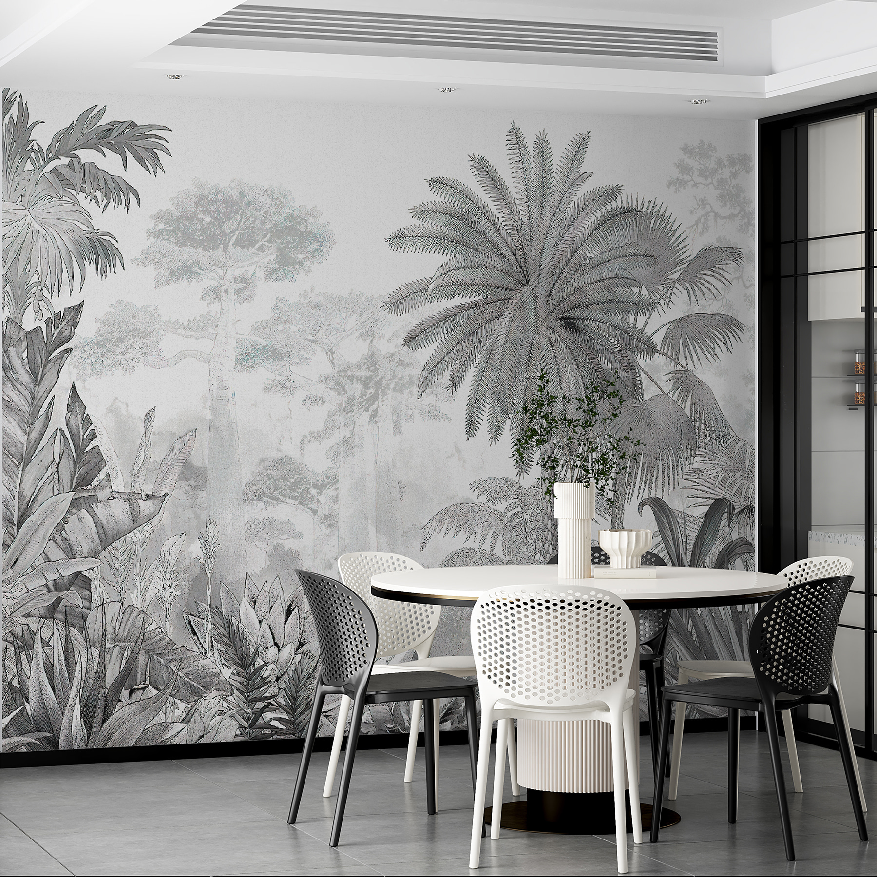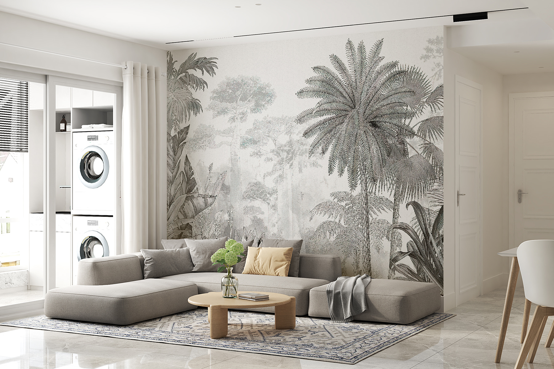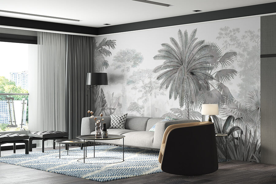 Deze muurschildering heeft een betoverende mix van palmbomen en junglebladeren, die diepte creëert en dat meeslepende gevoel geeft waar we allemaal stiekem naar hunkeren. Stel je voor dat je je woonkamer binnenloopt en het gevoel hebt dat je net uit de drukte bent gestapt en in een dromerig tropisch paradijs bent beland. Het is geweldig als statement muur en de monochrome tinten maken het verfijnd, niet overweldigend.