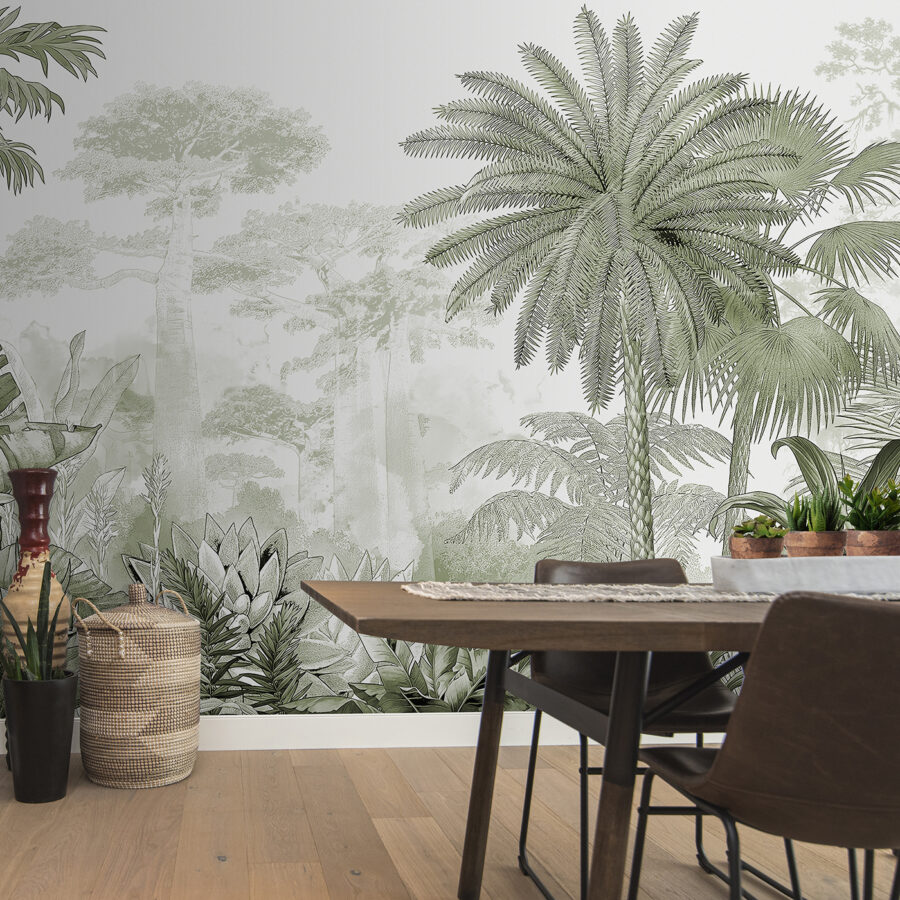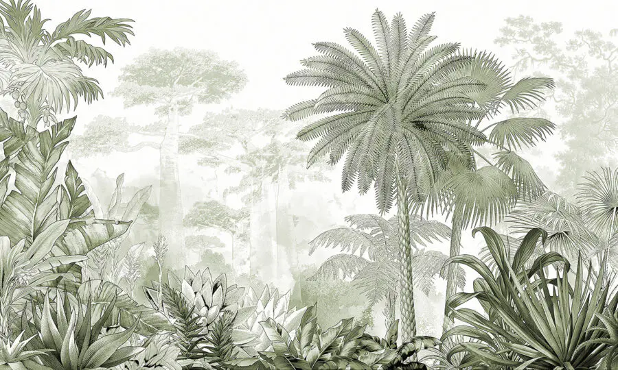 Stel je voor dat je je eigen persoonlijke oase in de jungle binnenstapt elke keer dat je een kamer binnenstapt! Deze muurschildering “Lush Tropical Greenery” verandert elke ruimte direct in een rustgevende ontsnapping. Stel je eens voor: torenhoge palmen, dicht gebladerte en ingewikkelde bladeren in kalmerende groene tinten. Je kunt de koele schaduw bijna voelen en het geritsel van de bladeren horen wiegen in een zacht briesje.