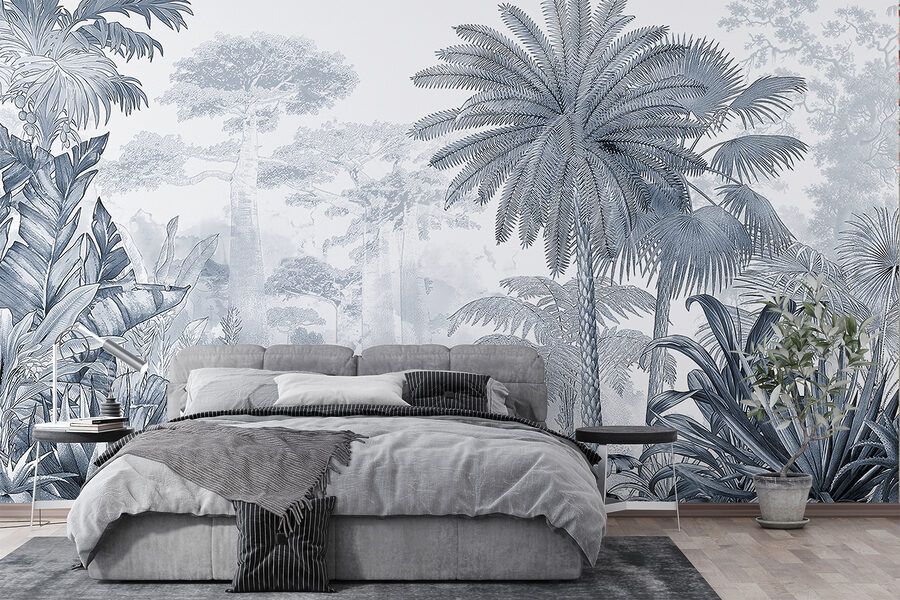 Heb je ooit een stukje jungle in je huis willen halen zonder dat je je zorgen hoeft te maken dat er wilde dieren in je huis komen wonen? Dan is deze “Tropical Paradise in Delicate Grayscale” muurschildering misschien iets voor jou. Het zijn weelderige, gedetailleerde bomen en planten die op de een of andere manier zowel rustgevend als avontuurlijk aanvoelen. Stel je voor dat je ‘s ochtends aan je koffie nipt met dit tropische uitzicht – het voelt meteen als een minivakantie, toch?