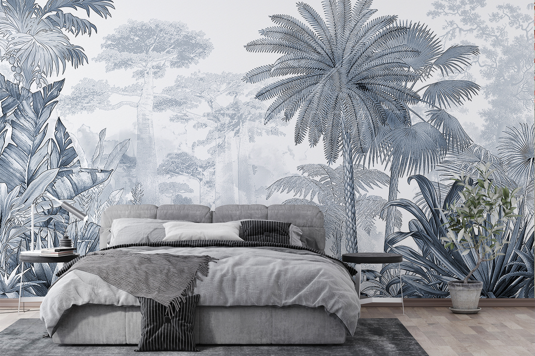 Heb je ooit een stukje jungle in je huis willen halen zonder dat je je zorgen hoeft te maken dat er wilde dieren in je huis komen wonen? Dan is deze “Tropical Paradise in Delicate Grayscale” muurschildering misschien iets voor jou. Het zijn weelderige, gedetailleerde bomen en planten die op de een of andere manier zowel rustgevend als avontuurlijk aanvoelen. Stel je voor dat je ‘s ochtends aan je koffie nipt met dit tropische uitzicht – het voelt meteen als een minivakantie, toch?