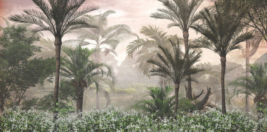“Serene ochtend in tropisch paradijs” muurschildering – is die naam niet uitnodigend? Stel je voor dat je wakker wordt met deze vredige scène in je woonkamer. Levendig groen, tere bloesems en die torenhoge palmbomen, allemaal gehuld in een zachte ochtendmist. Het is alsof je je eigen privéjungle binnenstapt, zonder je bank te verlaten.