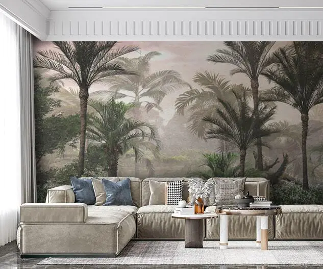 “Serene ochtend in tropisch paradijs” muurschildering – is die naam niet uitnodigend? Stel je voor dat je wakker wordt met deze vredige scène in je woonkamer. Levendig groen, tere bloesems en die torenhoge palmbomen, allemaal gehuld in een zachte ochtendmist. Het is alsof je je eigen privéjungle binnenstapt, zonder je bank te verlaten.