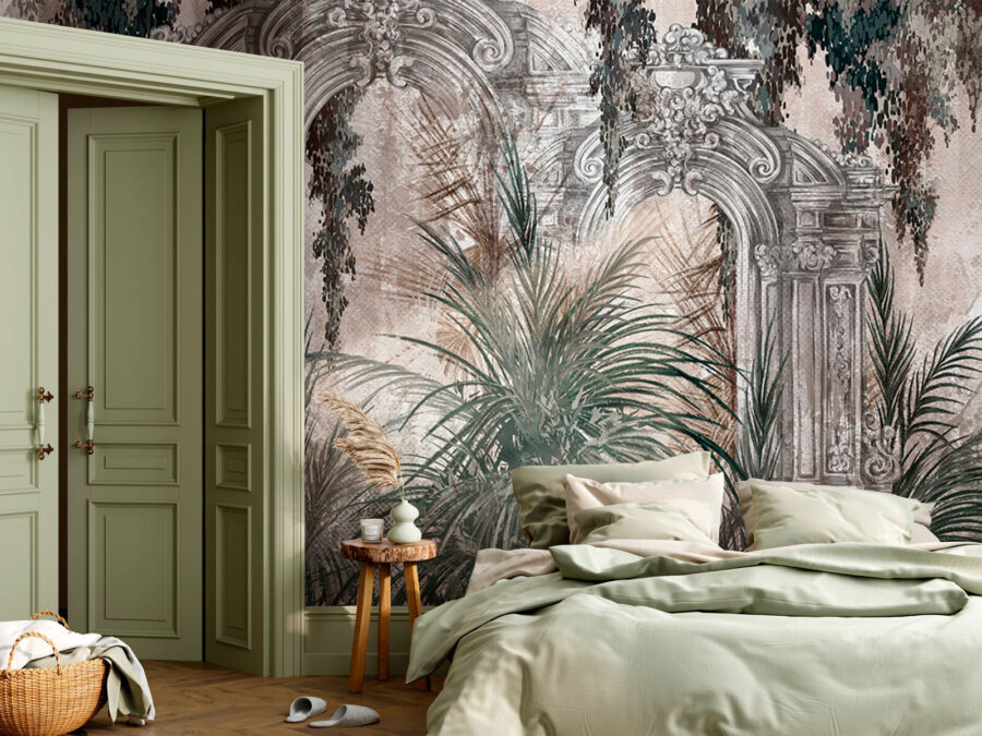 Een ruimte omtoveren in een tropisch toevluchtsoord is eenvoudiger met deze prachtige muurschildering. Stel je voor dat je vanuit je woonkamer een weelderige jungle binnenstapt. Dit kunstwerk nodigt je uit om even aan de werkelijkheid te ontsnappen. De gedetailleerde boog omlijst een prachtige plantenscène, waarbij elegantie en natuur moeiteloos samengaan. Het is alsof je een persoonlijk stukje paradijs aan je muur hebt! Stel je voor dat vrienden het bewonderen en commentaar geven op hoe het de sfeer direct opvrolijkt. Perfect voor wie houdt van een vleugje natuur zonder het onderhoud van echte planten. Wie wist dat muurkunst zo vrolijk kon zijn?