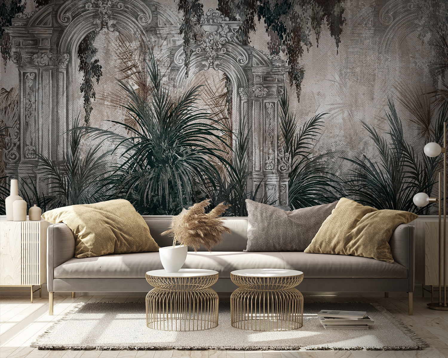 Een ruimte omtoveren in een tropisch toevluchtsoord is eenvoudiger met deze prachtige muurschildering. Stel je voor dat je vanuit je woonkamer een weelderige jungle binnenstapt. Dit kunstwerk nodigt je uit om even aan de werkelijkheid te ontsnappen. De gedetailleerde boog omlijst een prachtige plantenscène, waarbij elegantie en natuur moeiteloos samengaan. Het is alsof je een persoonlijk stukje paradijs aan je muur hebt! Stel je voor dat vrienden het bewonderen en commentaar geven op hoe het de sfeer direct opvrolijkt. Perfect voor wie houdt van een vleugje natuur zonder het onderhoud van echte planten. Wie wist dat muurkunst zo vrolijk kon zijn?