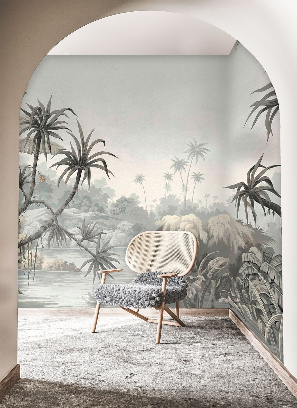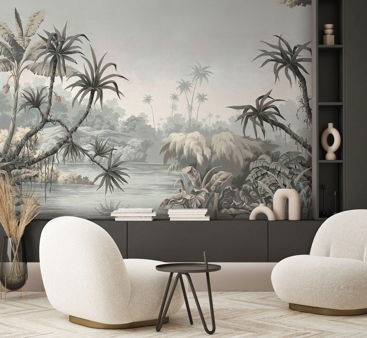 Stel je voor dat je in je woonkamer zit en in plaats van naar lege muren te staren, word je getransporteerd naar deze serene tropische oase bij je thuis. Deze muurschildering “Tropisch landschap in gedempte tinten” is als een frisse wind met een vleugje jungle mysterie. Het is niet te schreeuwerig maar geeft toch die weelderige, groene sfeer van dicht gebladerte en exotische bomen weer.