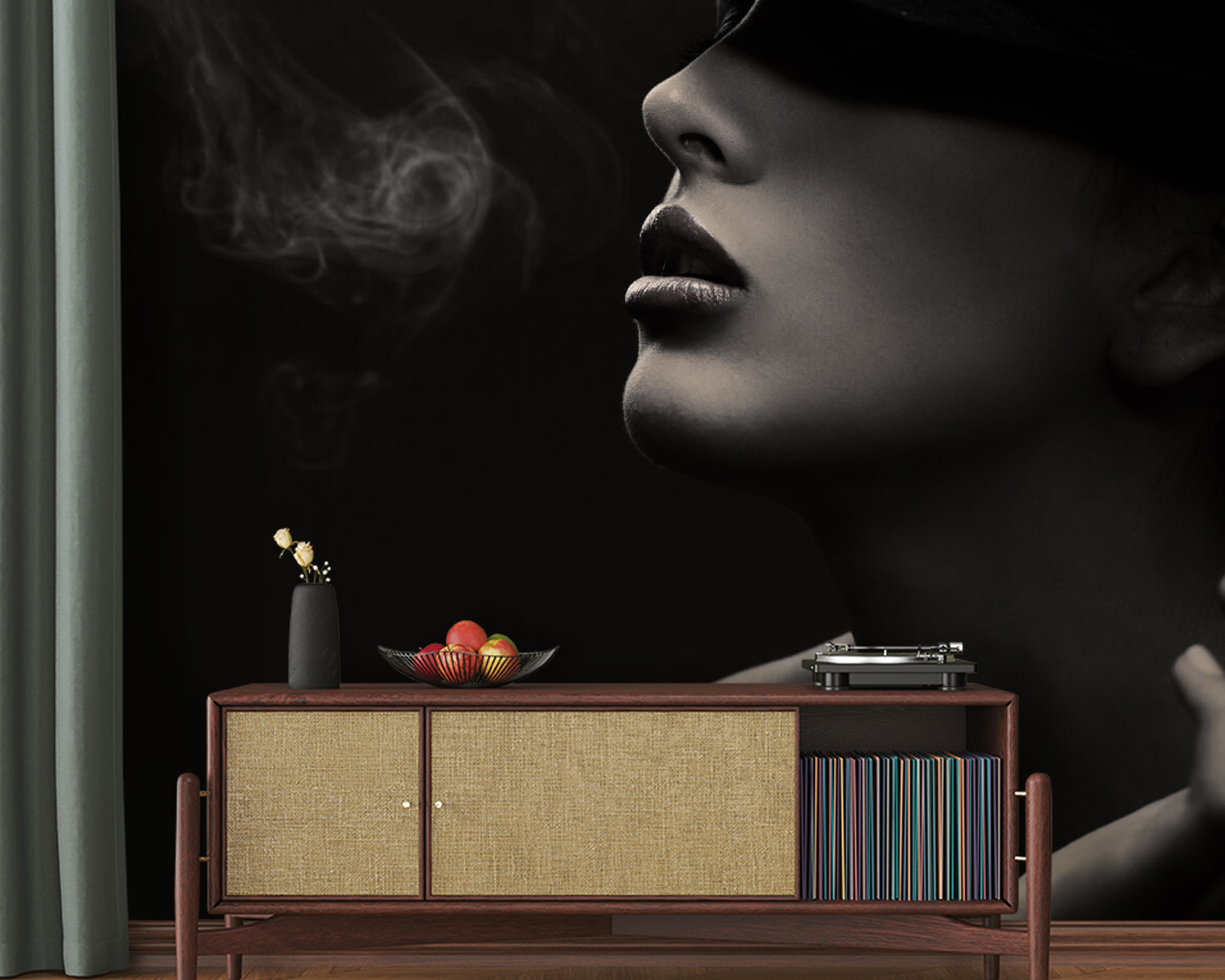 Verander je ruimte in een kunstzinnig toevluchtsoord met deze boeiende muurschildering van een vrouw met een hoed, nonchalant rokend. Het is alsof je een stijlvol café binnenstapt waar elke hoek elegantie en intrige uitstraalt. De manier waarop ze in de verte staart, omgeven door een werveling van rook, voegt een vleugje mysterie toe – perfect om interessante gesprekken op gang te brengen.