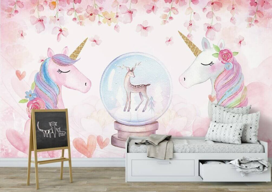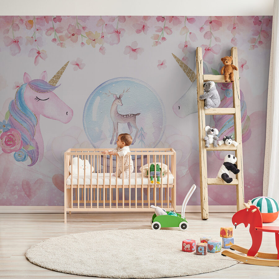 Met zachte eenhoorns te midden van zachtroze bloementinten en een prachtig hert in een sneeuwbol, voelt deze muurschildering alsof ze rechtstreeks uit een sprookje komt. De zachte aquareltinten zijn rustgevend, terwijl de speelse details inspireren tot fantasie en eigenzinnigheid.