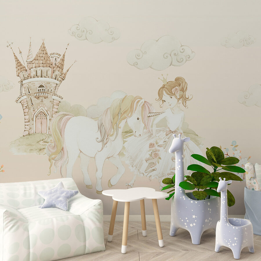 Stel je een muur voor die je rechtstreeks meeneemt in een grillig sprookje – een kasteel in de verte, een prinses met haar trouwe eenhoorn aan haar zijde. Met deze muurschildering stap je elke keer dat je de kamer binnenkomt in een dromerig verhaal. De zachte pasteltinten en delicate details zijn gewoon… magisch. Perfect voor een kinderkamer of voor iedereen die van een beetje betovering in zijn leven houdt. En die pluizige wolkjes en lieve bloemen? Dan voelt elke dag als een zonnige dag in een sprookjesland. Over een stuk gesproken dat de verbeelding aanwakkert en je doet glimlachen!