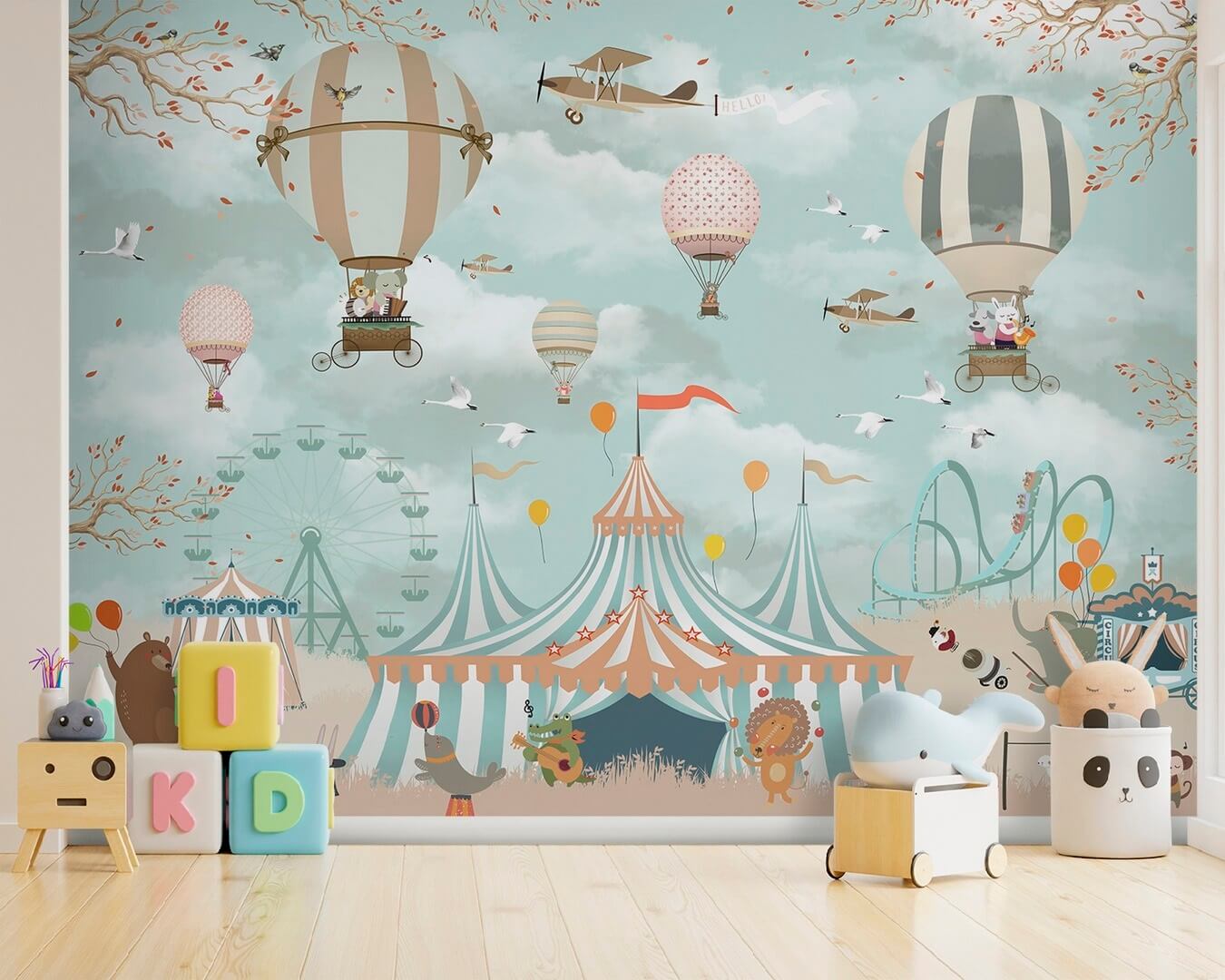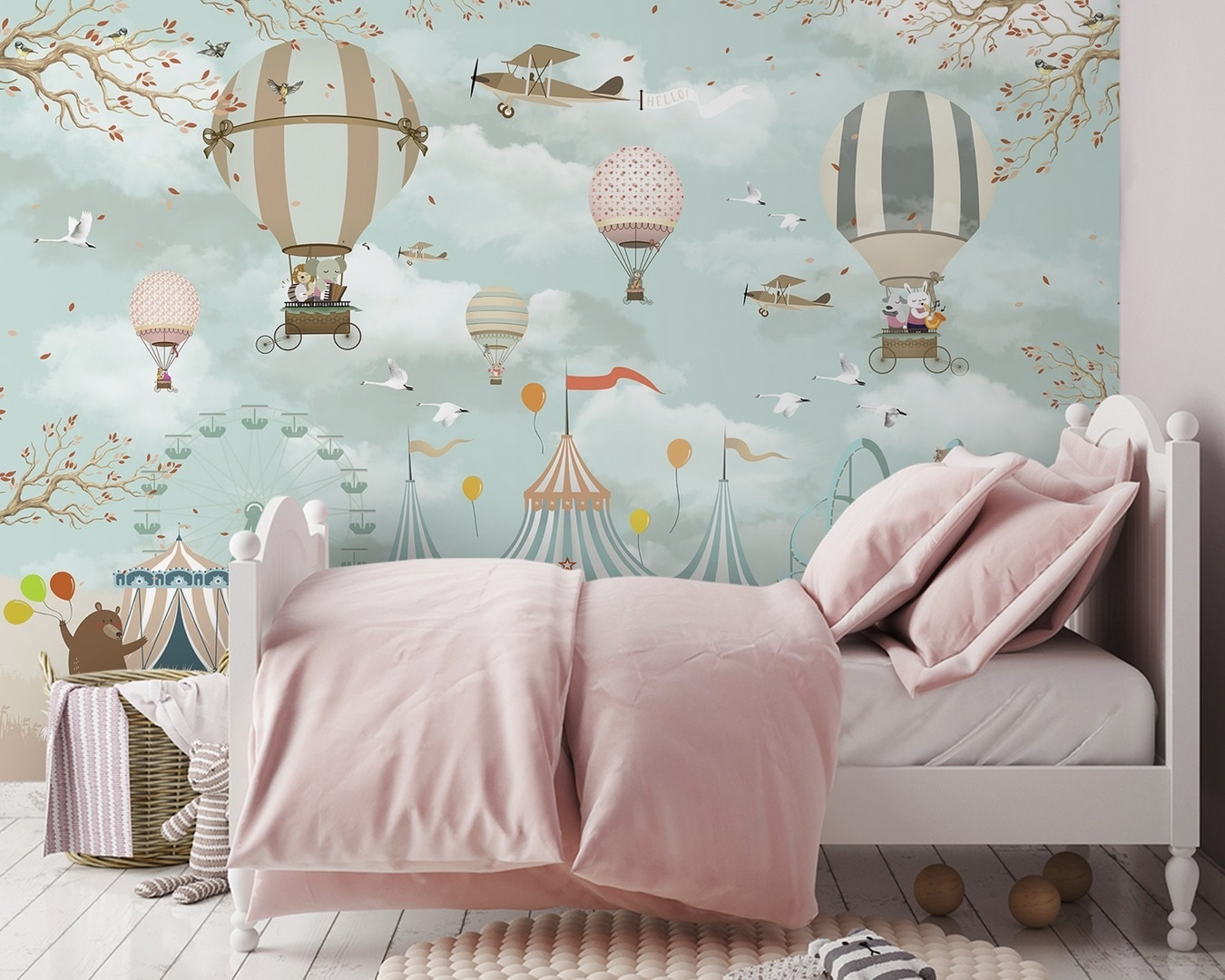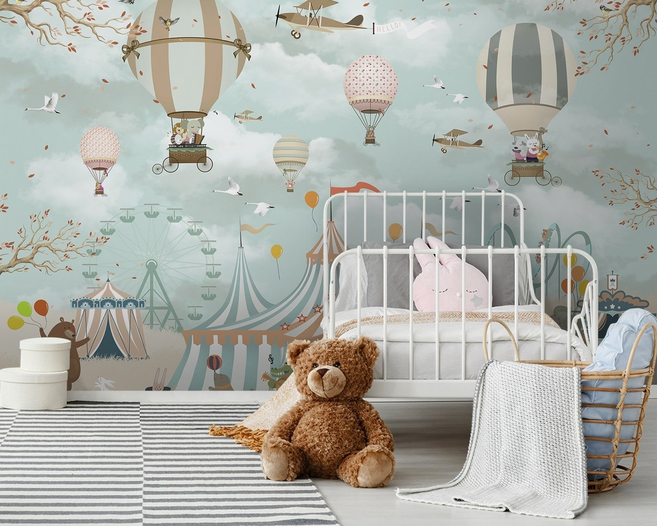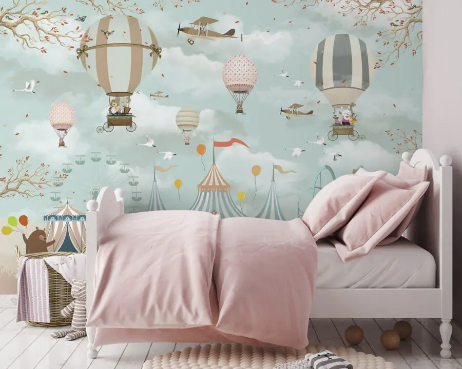 Stel je voor dat je een ruimte binnenloopt die aanvoelt als een grillig avontuur. Deze muurschildering met charmante heteluchtballonnen en speelse vogels creëert een heerlijke hemel waar de verbeelding de vrije loop gaat. Elk personage brengt een beetje vreugde, waardoor verhalen en dagdromen worden aangewakkerd – of het nu een dappere olifant is of een dappere beer met ballonnen. Perfect voor de kinderkamer of elke andere plek die wel een vleugje plezier kan gebruiken. Het roept jeugdherinneringen op aan uitstapjes naar het circus en zonnige dagen in de buitenlucht. Tover de muur om en laat de magie zijn gang gaan – wie wil er nu niet wegdromen onder deze betoverende hemel?