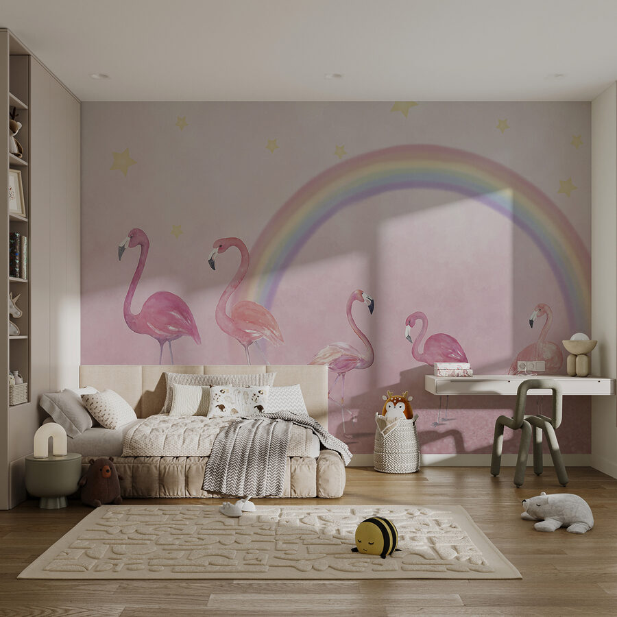Heb je het gevoel dat de ruimte van je kind iets extra’s nodig heeft? Maak dan kennis met onze muurschildering “Roze flamingo op roze achtergrond”! Stel je voor dat je wakker wordt met een parade van deze prachtige gevederde vrienden – zo levendig tegen die dromerige roze lucht. Het is alsof je elke ochtend in een sprookje stapt. De sterretjes en regenboog maken het helemaal af, vind je niet? Perfect om de verbeelding aan te wakkeren! Bovendien staat deze muurschildering in de categorieën kindermuurschilderingen en populaire muurschilderingen – het is vast niet voor niets een hit! Strooi een beetje magie op de muren en zie de hele kamer tot leven komen!