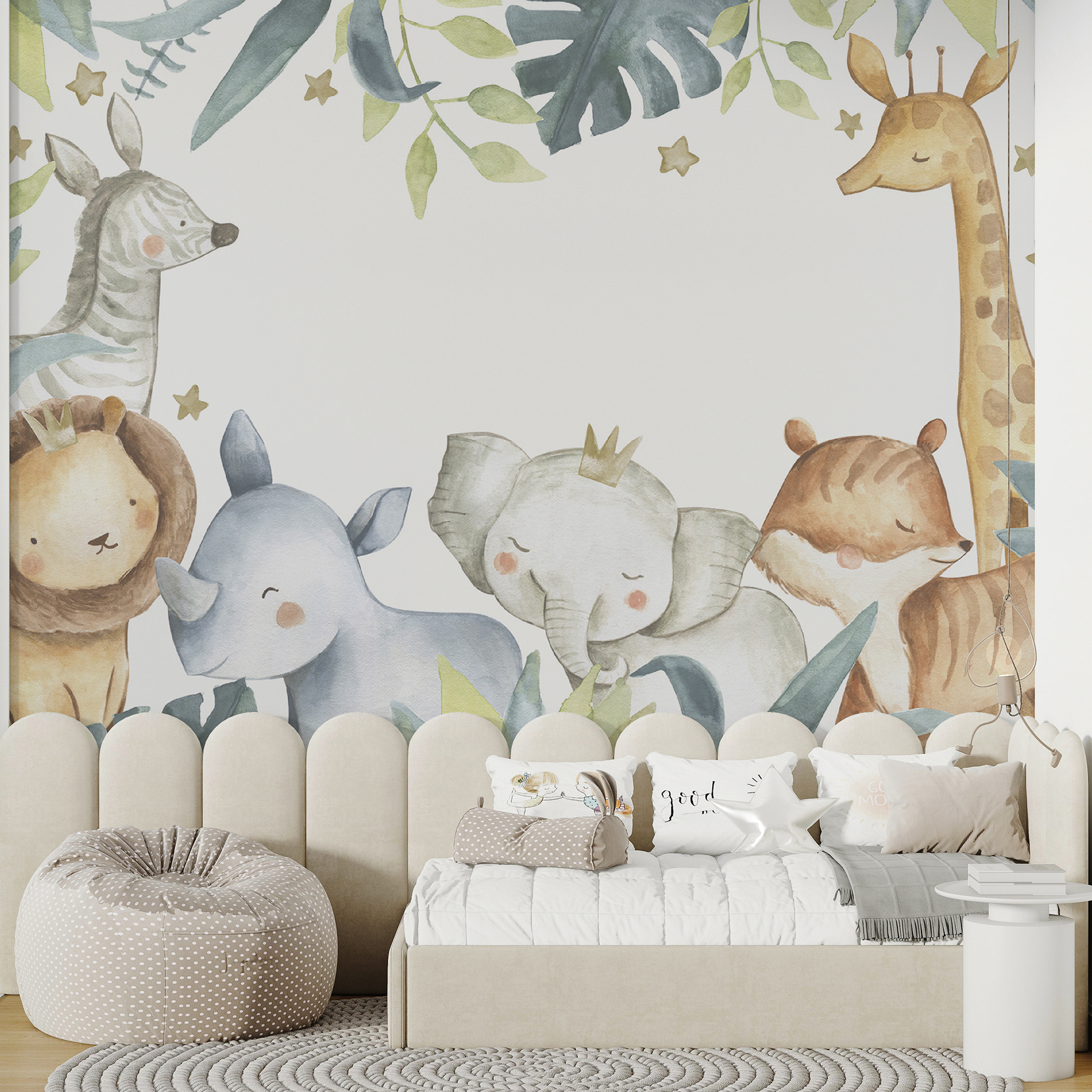 Wil je de ruimte van je kleintje opvrolijken? Deze schattige muurschildering “Aquarel van een olifant en een vos” is een absolute must-have! Stel je zachte, dromerige aquareltinten voor die een charmante scène op de muur schilderen – perfect voor een kinderkamer of kinderkamer! De schattige en vriendelijke dieren, zoals een olifant in een klein kroontje en een lieve, snoezende vos, zullen zeker een glimlach op je gezicht toveren. Bovendien voegen het bladerrijke frame en de grillige sterren een extra vleugje magie toe. Stel je de verrukking van je kind voor, gewikkeld in deze betoverende, verhalenboekachtige wereld. Het is niet alleen decoratie, het is een dagelijkse dosis vreugde! En hé, wie kan een getemd safariavontuur voor zijn kleine ontdekkingsreiziger weerstaan?