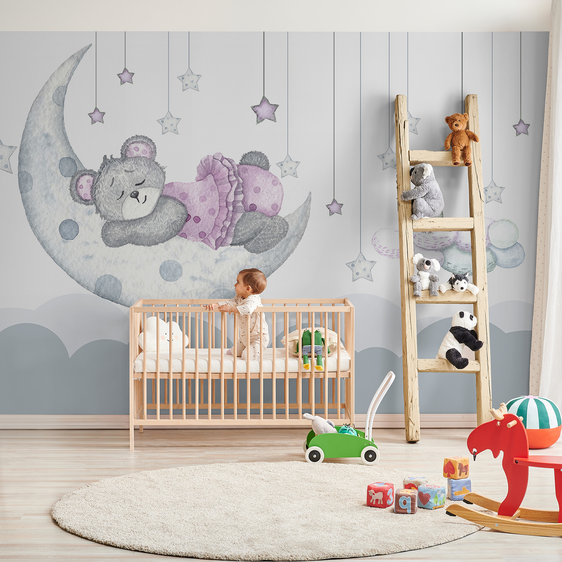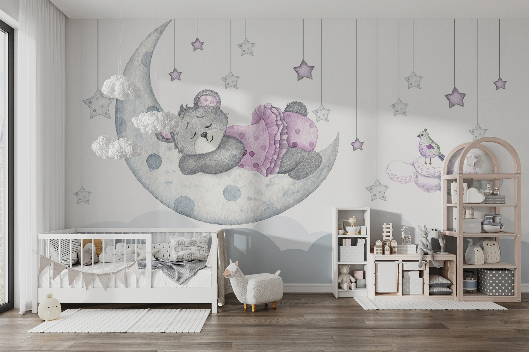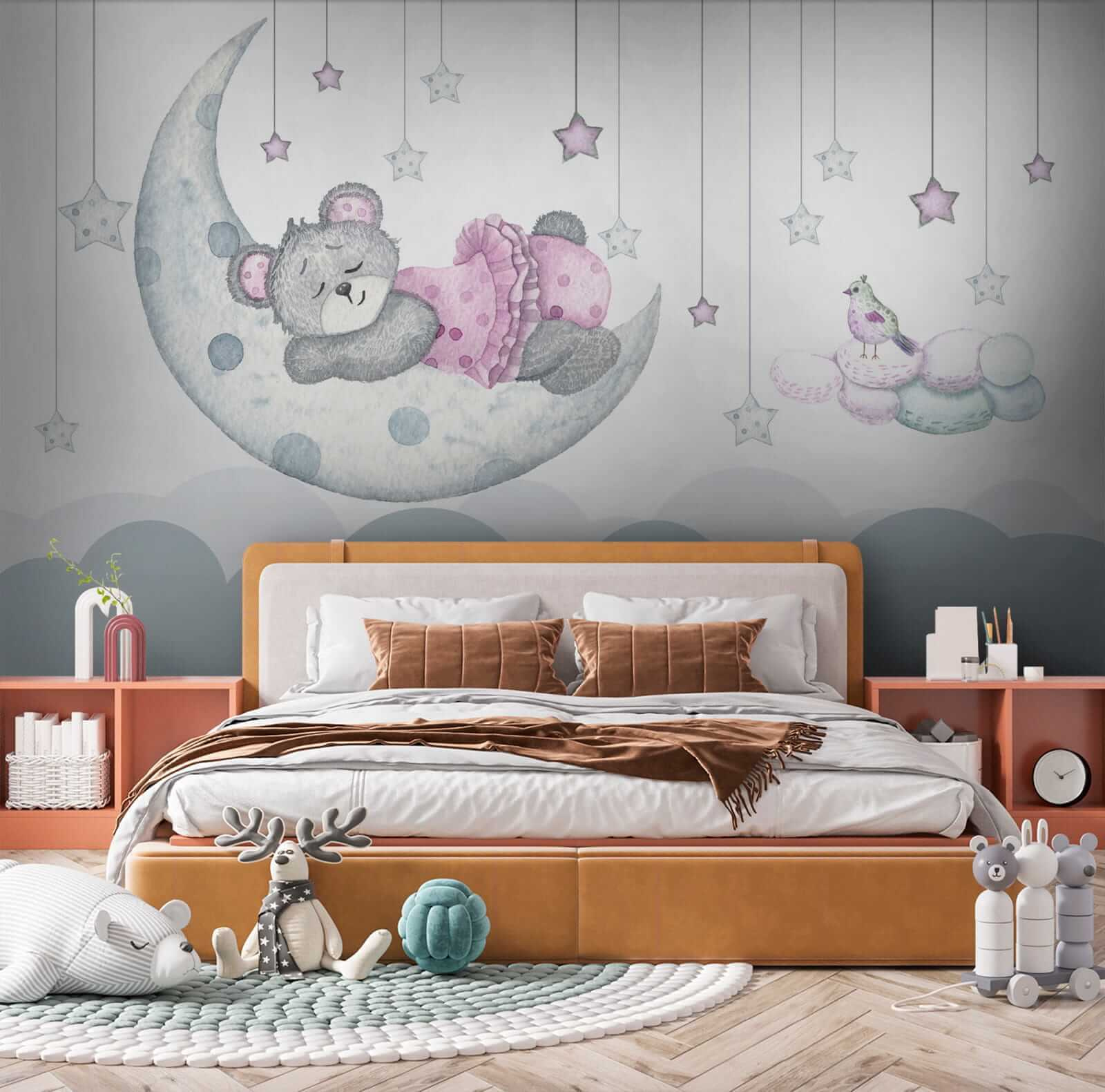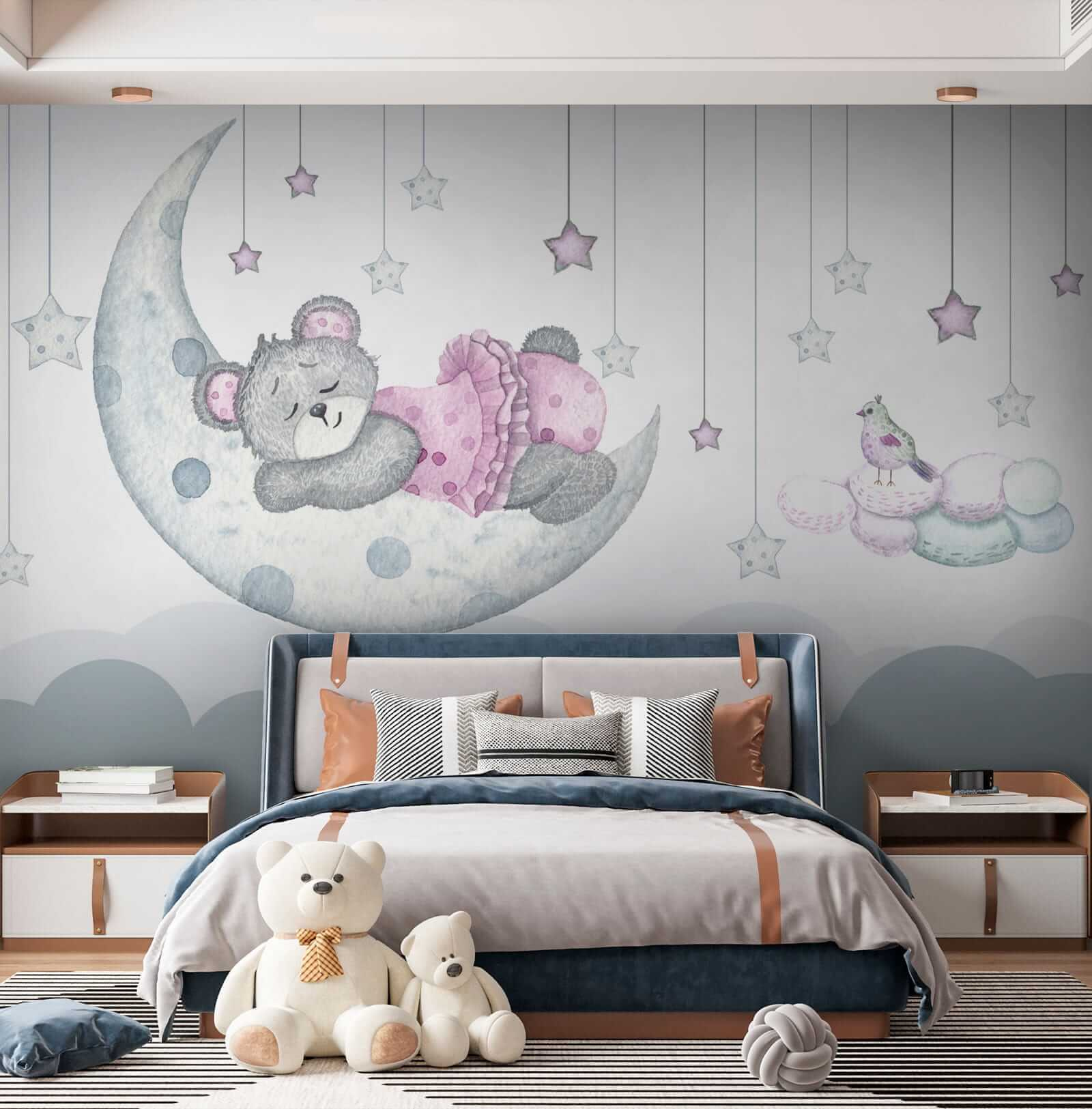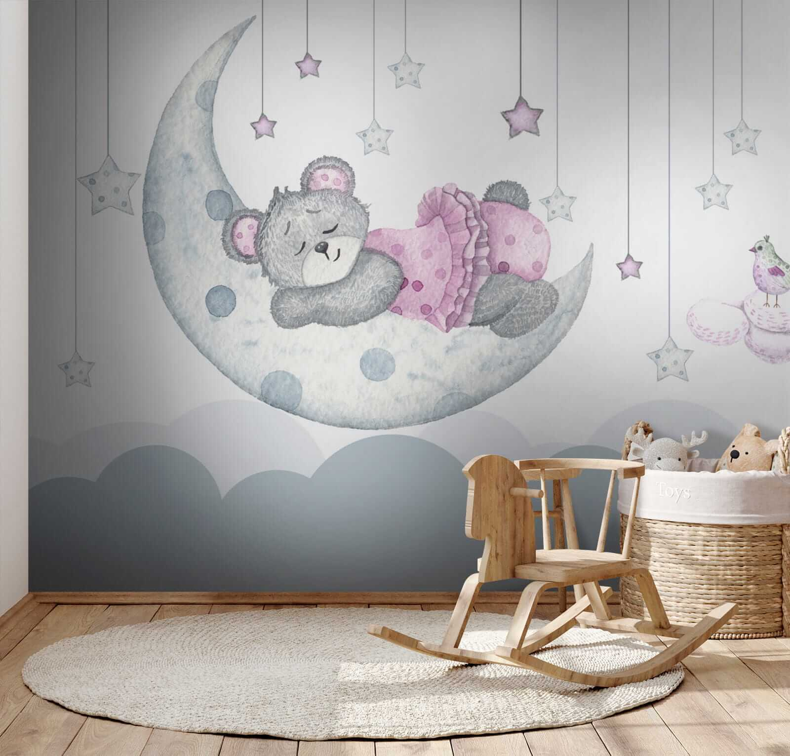 Stel je een teddybeer voor in een roze jurk, vredig sluimerend op de maan – klinkt dromerig, toch? Deze aquarelmuurschildering is perfect om een vleugje magie toe te voegen aan elke kinderkamer. Het is zacht en grillig, met zachte pastelkleuren die een rustgevende sfeer creëren… perfect voor verhaaltjes voor het slapengaan en zoete dromen! Stel je de blik op het gezicht van je kleintje voor als ze hun nieuwe beste vriend aan de muur zien hangen. Bovendien is het een geweldige achtergrond voor leuke foto’s. Gezelligheid en creativiteit – deze muurschildering brengt het allebei!