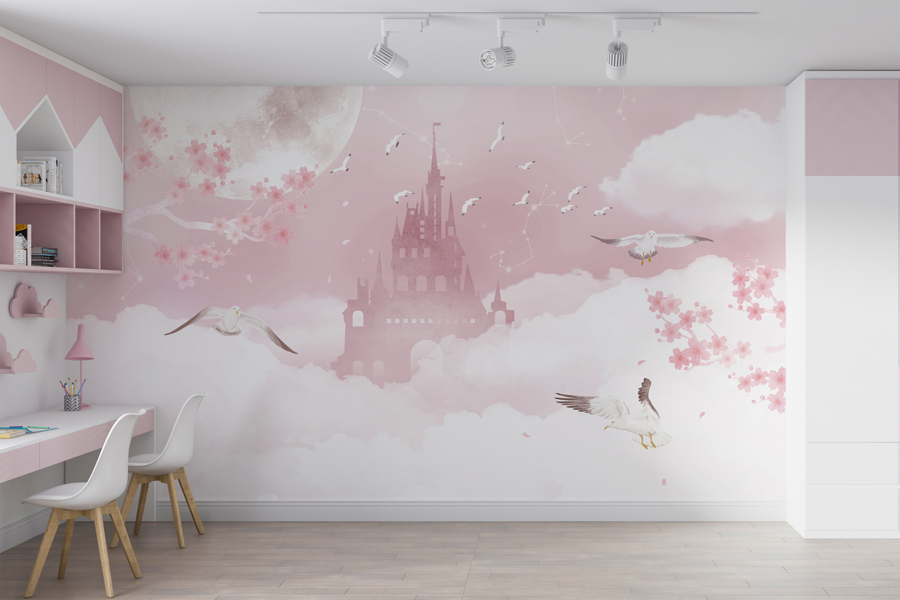Bekijk deze dromerige “Fotobehang White Bird Flying in the Sky”-het is alsof je in een grillige fantasie stapt! Perfect voor kinderkamers, vooral als je kleintje van sprookjes en betoverende taferelen houdt. Stel je eens voor: zachte, pluizige wolken, vogels die vrij rondvliegen, een magisch kasteel op de achtergrond en tere kersenbloesems… Het is net een verhaaltje voor het slapengaan dat tot leven komt.