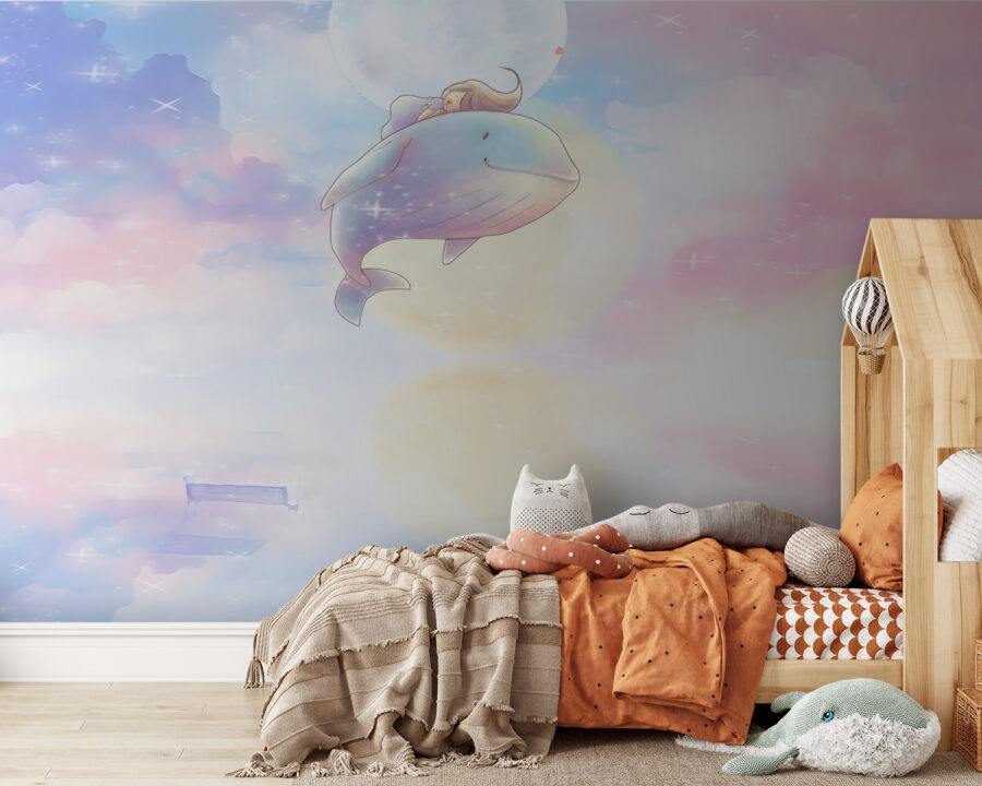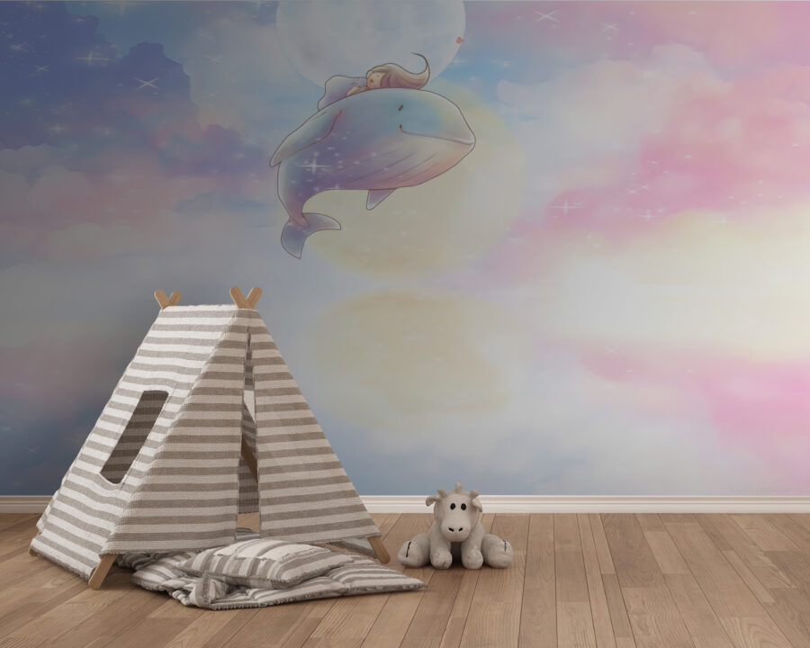 Maak kennis met je nieuwe beste vriend aan de muur – de “Cartoon van een walvis” muurschildering! Deze dromerige scène is als een lieve kleine reis naar een magische wereld, waar een vriendelijke walvis de rit van je kind is door pluizige pastelkleurige wolken. Perfect voor de kamer van je dochter of een andere creatieve ruimte!