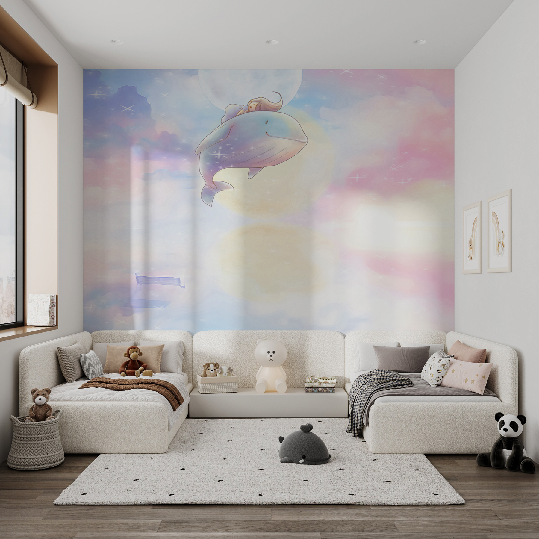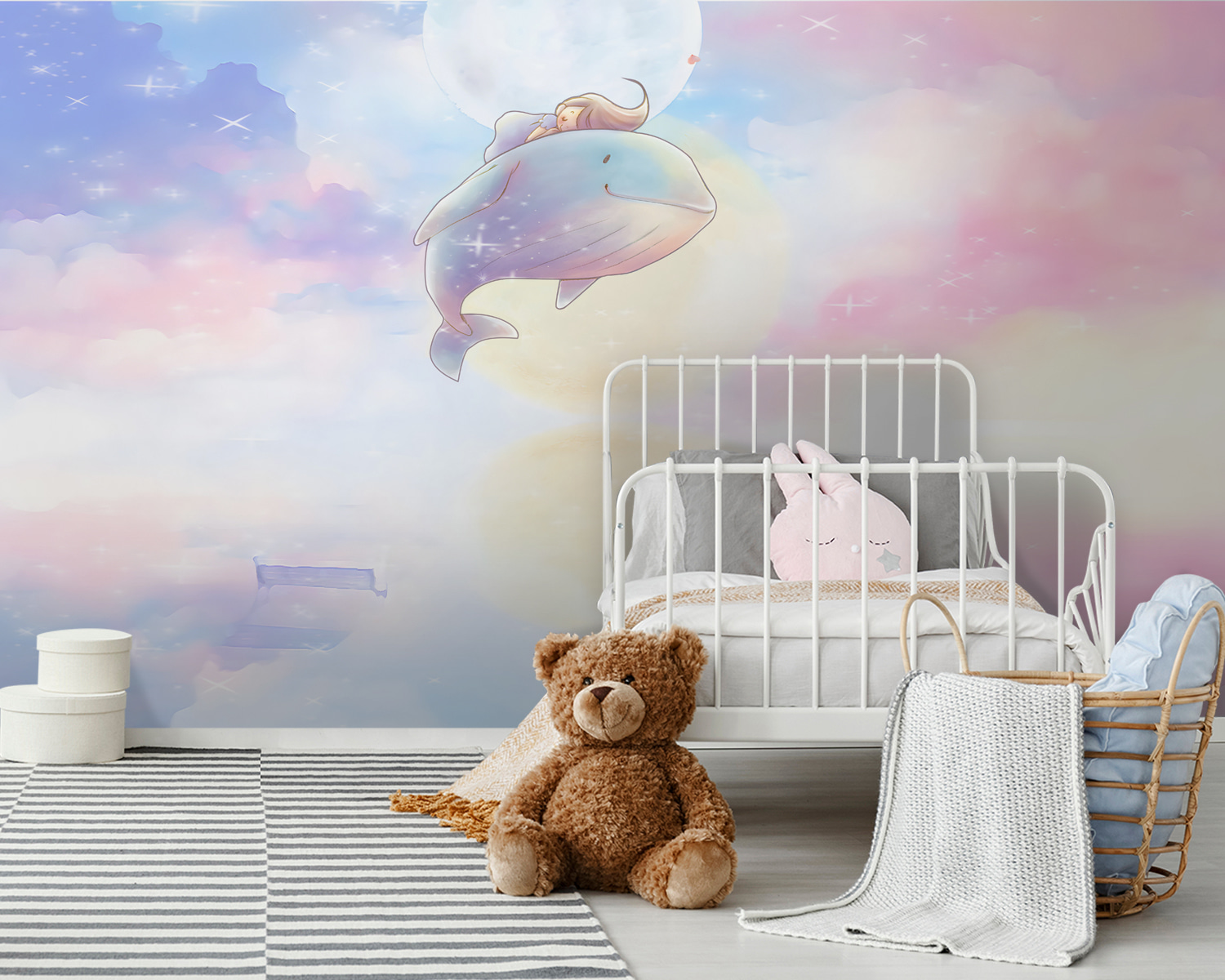 Maak kennis met je nieuwe beste vriend aan de muur – de “Cartoon van een walvis” muurschildering! Deze dromerige scène is als een lieve kleine reis naar een magische wereld, waar een vriendelijke walvis de rit van je kind is door pluizige pastelkleurige wolken. Perfect voor de kamer van je dochter of een andere creatieve ruimte!