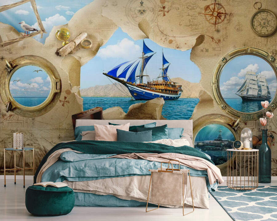 Ahoy maatje! Duik in de wereld van avontuur met deze muurschildering “Zeilavonturen op een schatkaart”. Het is net alsof je je kamer een magisch venster naar de volle zee geeft! Stel je voor dat je kleintje in een spannend piratenverhaal stapt telkens als ze binnenkomen. Dat schip met zijn majestueuze blauwe zeilen, de schatkaart en al die nautische snufjes? Gewoon perfect.