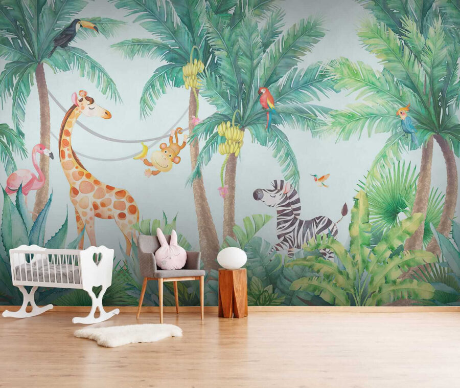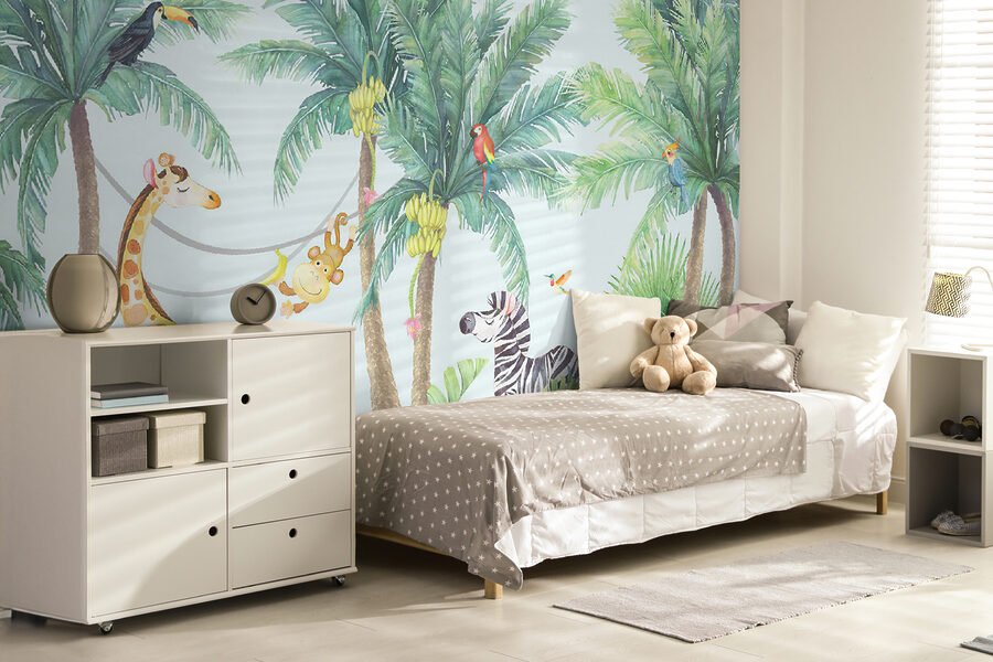 Fleur de kamer van je kind op met deze prachtige “Fotobehang Tropical Animals Enjoying the Jungle Vibes!”. Stel je deze scène voor: brutale apen die aan lianen slingeren, een vriendelijke giraffe en een zebra die er super chill uitziet – allemaal omringd door weelderige, groene palmen. Het is net alsof je een mini-jungle safari thuis hebt! Perfect om de liefde voor de natuur en dieren bij kleine ontdekkingsreizigers te stimuleren. En wie wil er nou niet elke ochtend wakker worden met een flamingo die gedag zegt? Deze muurschildering brengt een uitbarsting van vreugde en avontuur, waardoor elke ruimte levendig en vrolijk aanvoelt.