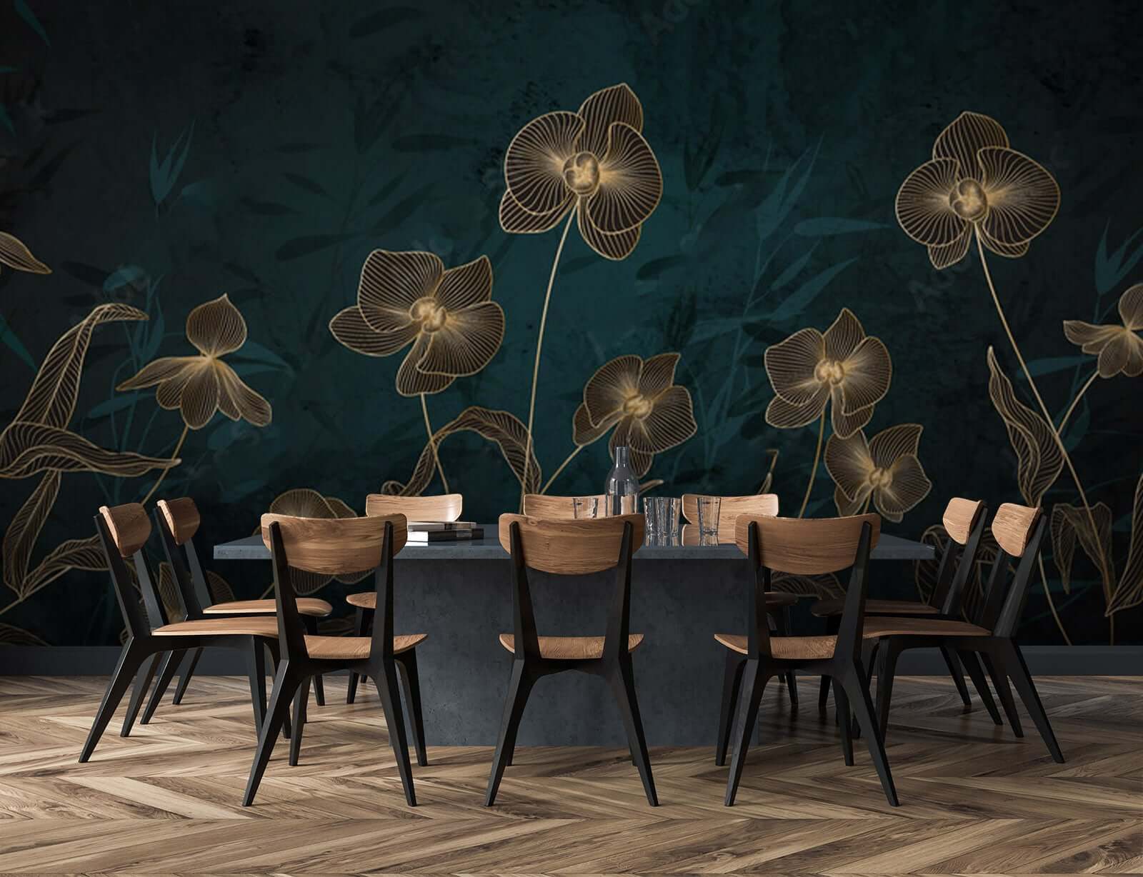 Transformeer elke kamer met deze prachtige muurschildering met een elegant bloemenontwerp tegen een donkere achtergrond. Stel je voor dat je een ruimte binnenloopt waar delicate bloemen verhalen over serene tuinen fluisteren, waardoor je je in een oase van rust waant. Het is de perfecte manier om een warme, uitnodigende sfeer te creëren die zowel modern als tijdloos aanvoelt. Kinderen zullen dol zijn op de betoverende sfeer en zelfs volwassenen zullen wegdromen terwijl ze naar die prachtige bloemen staren. Deze muurschildering voegt een vleugje natuurschoon toe en verandert gewone muren in een feest van kunst en elegantie.