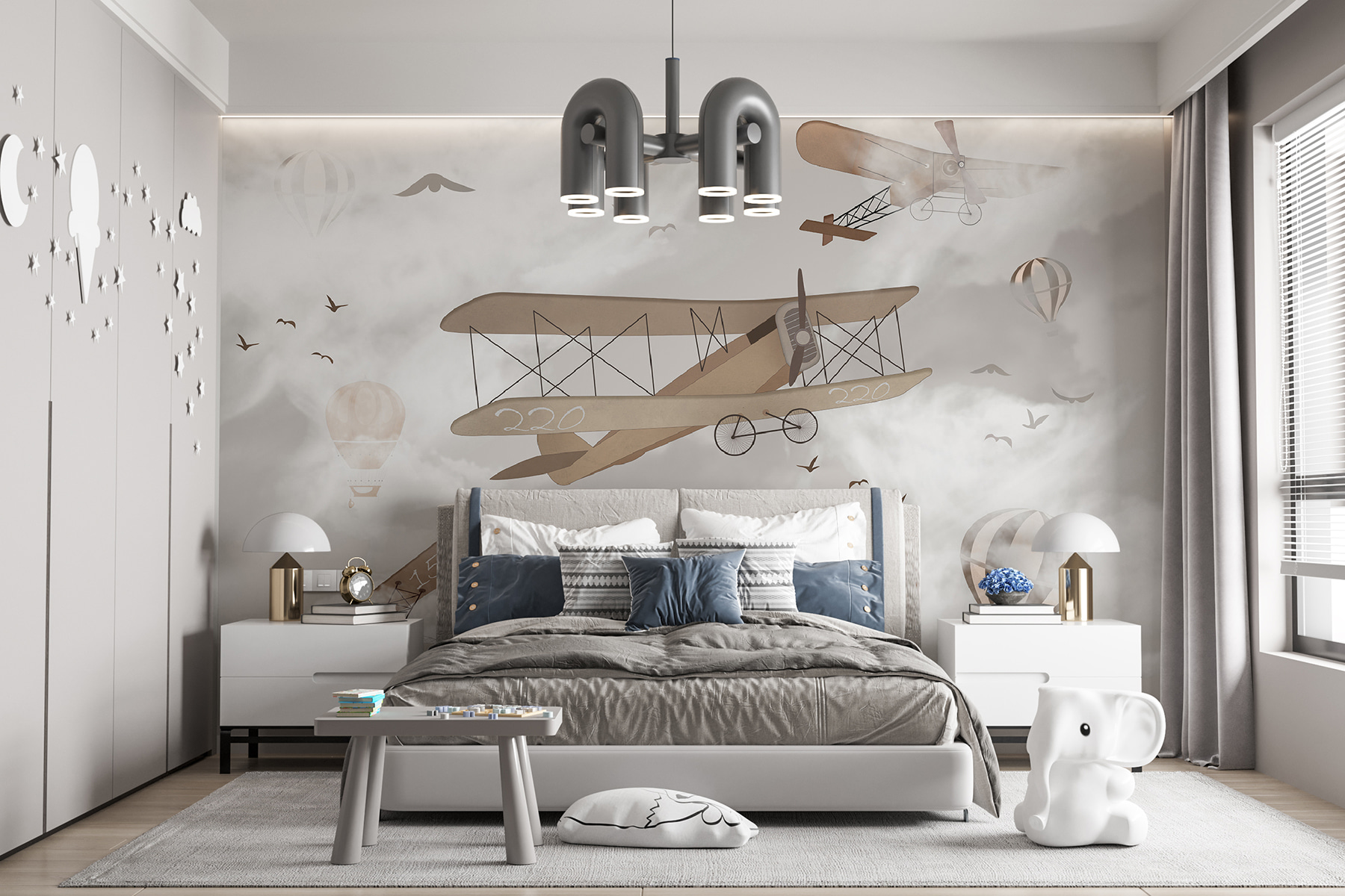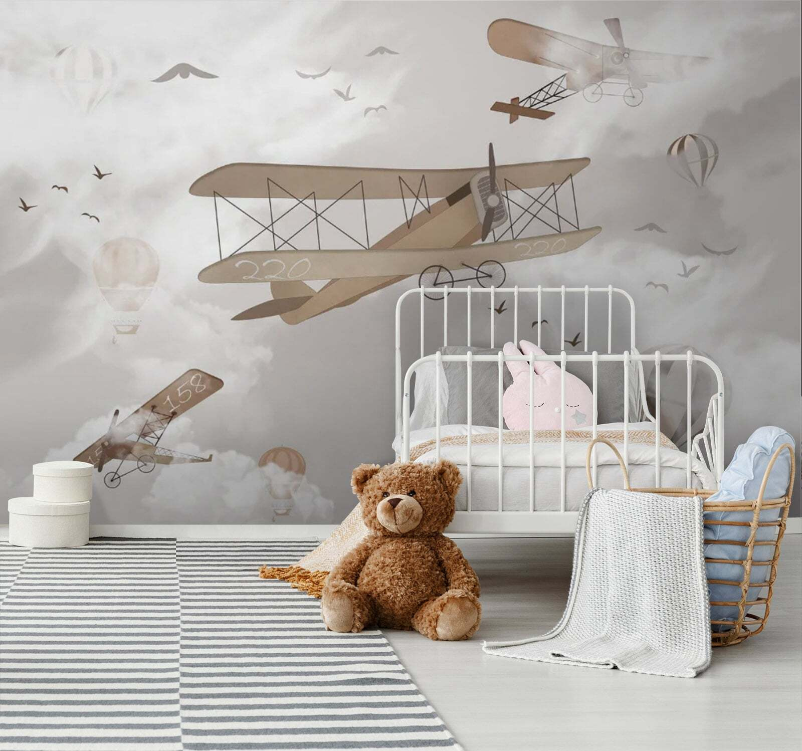 Stel je voor dat je hoog boven de wolken zweeft met deze betoverende muurschildering “Hete luchtballon in de lucht”. Het grillige ontwerp van deze muurschildering, perfect voor kinderkamers of voor iedereen die jong van hart is, laat heteluchtballonnen en vintage vliegtuigen zien die tussen de wolken dansen – echt dromerig! Stel je voor dat je elke dag wakker wordt met dit tafereel, alsof je op een eindeloos avontuur bent.