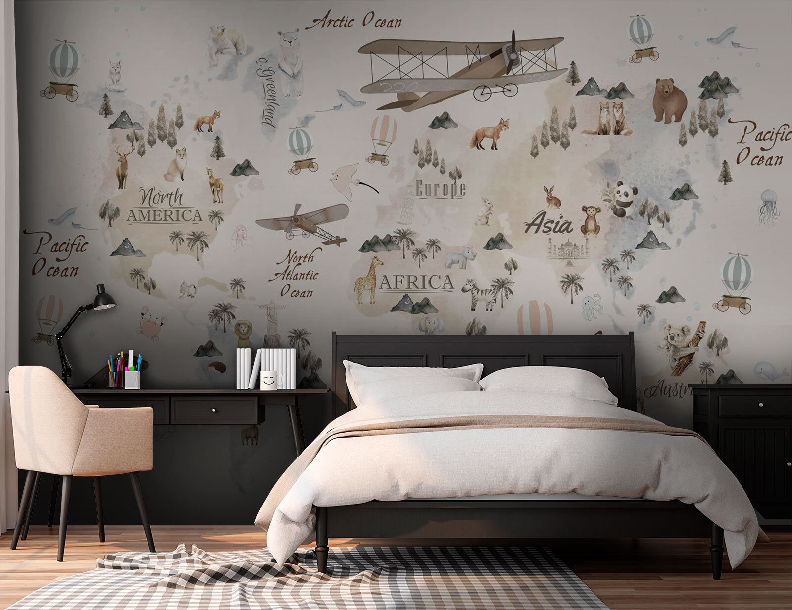 Stel je voor dat je de kamer van je kind omtovert tot een dromerig avontuur! Deze “Vintage Map with Animals & Aircrafts” muurschildering is pure magie en zeker niet alleen voor kinderen. Het heeft die prachtige ouderwetse charme vermengd met grillige accenten – heteluchtballonnen, charmante dieren en vintage vliegtuigen. Je zult er zelf ook in verdwalen!