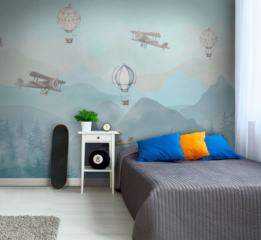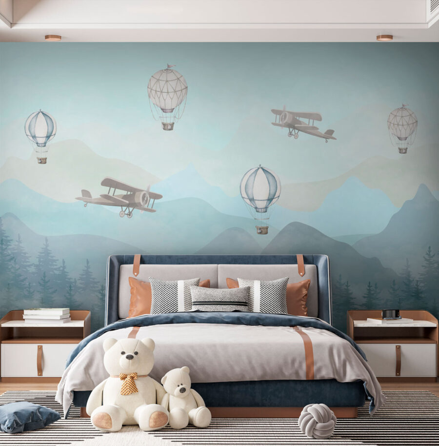 Stel je voor dat je wakker wordt met een zachte, dromerige lucht met vintage vliegtuigen en charmante heteluchtballonnen die over mistige bergen zweven. Deze muurschildering “Vliegtuigen en ballonnen boven mistige bergen” is als een grillige reis naar een sereen fantasieland. Perfect voor de kinderkamer, voegt het een vleugje magie en verwondering toe en inspireert kleine avonturiers dagelijks. Denk aan kalmerende verhaaltjes voor het slapengaan of dagdromen in de ochtend. De pasteltinten zijn een lust voor het oog en geven elke ruimte het gevoel van een vlucht in de verbeelding. Absoluut prachtig, hè? Een heerlijke mix van betovering en rust, klaar om vreugde en nieuwsgierigheid op te wekken.