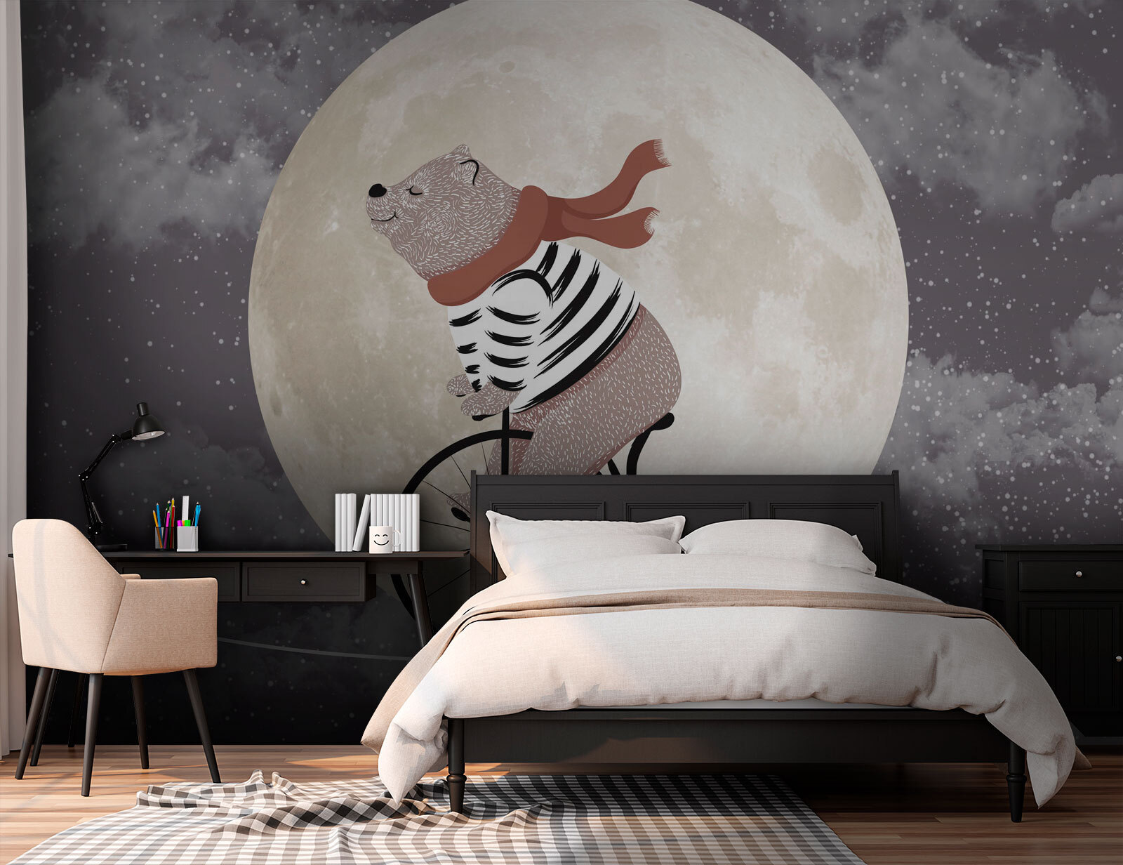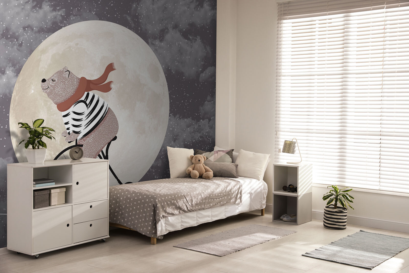 Stel je een gezellige kinderkamer voor, waar verhaaltjes voor het slapen gaan tot leven komen op de muren. De muurschildering “Beer fietst over de maan” brengt die magische sfeer rechtstreeks naar elke kinderkamer. Het is grillig, met deze charmante beer in een gestreept shirt en sjaal die over een gigantische, gloeiende maan fietst. Je hoeft er niet over na te denken – het is gewoon leuk en eigenzinnig. Perfect om de verbeelding aan te wakkeren en misschien een paar keer te giechelen. Stel je voor dat je kleintje hier ‘s nachts naar staart en grote dromen droomt. Dat is het soort warmte dat deze muurschildering uitstraalt.