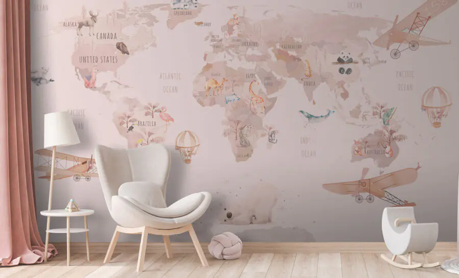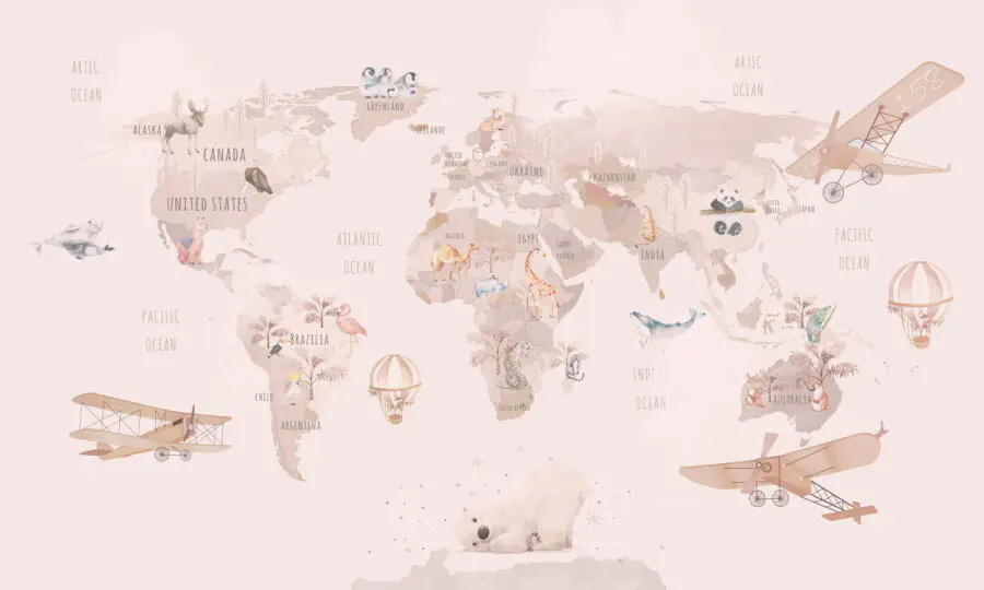 Zeg maar dag tegen saaie muren met deze charmante muurschildering! “Kaart van de wereld met dieren” is niet zomaar een kaart – het is een avontuur dat op zich laat wachten. Deze muurschildering is perfect voor de kamer van je kleine ontdekkingsreiziger en laat zien waar al hun favoriete dieren vandaan komen. Stel je voor dat je dochter giechelt bij de pinguïns op de Zuidpool, of dagdroomt over Afrikaanse giraffen en zonsondergangen in de Savannah. Bovendien voegt het een lief, grillig tintje toe aan elke ruimte. Educatief, leuk en absoluut schattig – maak je klaar voor veel “oohs” en “aahs” van zowel kinderen als volwassenen!