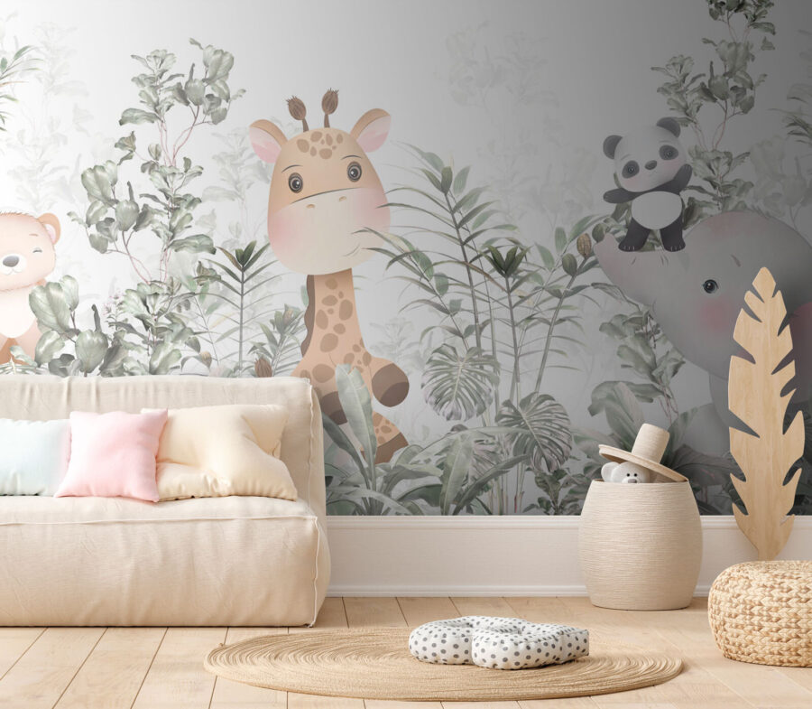 Tover een kinderkamer om in een grillig jungleavontuur met deze prachtige muurschildering met een charmante giraffe, speelse panda en een lief beertje. Stel je voor dat je de kamer binnenloopt en meteen de warmte voelt van een levendige, natuurlijke wereld – waar creativiteit bloeit en dromen hoogtij vieren. De zachte kleuren en betoverende dieren prikkelen de verbeelding, waardoor verhaaltjes vertellen nog magischer wordt. Perfect om te giechelen en gezellige gevoelens op te wekken, het is net alsof je een stukje natuur aan de muur hebt hangen. Wie wil er nou niet wakker worden omringd door deze kleurrijke groep? De jungle is er niet alleen voor de dieren, maar ook voor de kleintjes!