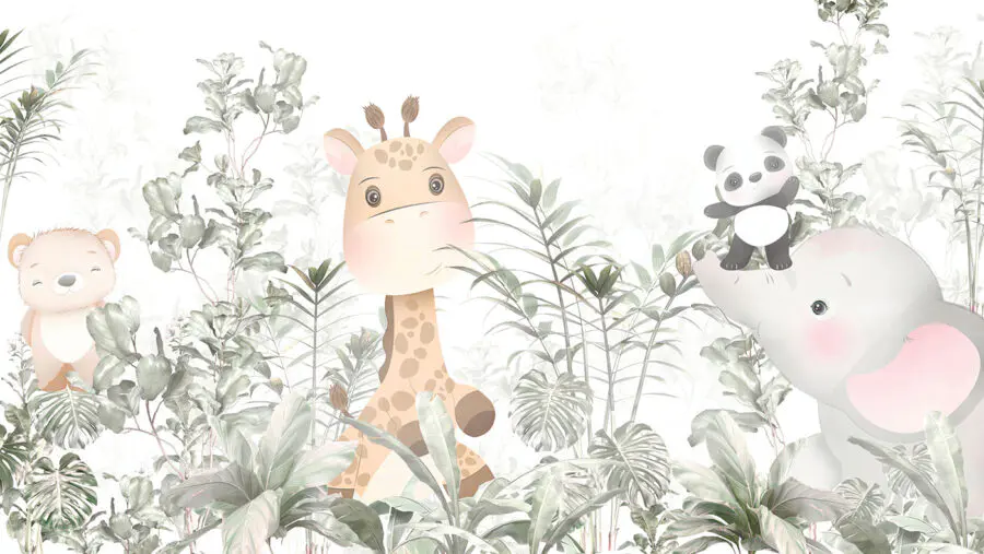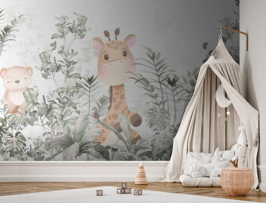 Tover een kinderkamer om in een grillig jungleavontuur met deze prachtige muurschildering met een charmante giraffe, speelse panda en een lief beertje. Stel je voor dat je de kamer binnenloopt en meteen de warmte voelt van een levendige, natuurlijke wereld – waar creativiteit bloeit en dromen hoogtij vieren. De zachte kleuren en betoverende dieren prikkelen de verbeelding, waardoor verhaaltjes vertellen nog magischer wordt. Perfect om te giechelen en gezellige gevoelens op te wekken, het is net alsof je een stukje natuur aan de muur hebt hangen. Wie wil er nou niet wakker worden omringd door deze kleurrijke groep? De jungle is er niet alleen voor de dieren, maar ook voor de kleintjes!