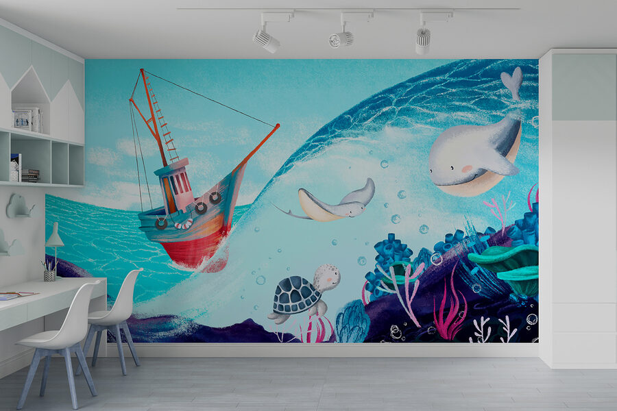 Duik in een wereld vol plezier met deze charmante muurschildering met vriendelijke walvissen die door een levendige onderwaterwereld zwemmen. Perfect voor de kinderkamer, het is alsof je een portaal opent naar een oceaan waar je je fantasie de vrije loop kunt laten. Stel je voor: kinderen die een blik werpen op de kleurrijke vissen en speelse schildpadden, hun ogen die oplichten van verwondering terwijl ze dit magische onderwaterleven elke dag verkennen. De zachte tinten brengen een gevoel van rust, waardoor het een gezellig toevluchtsoord is voor de kleintjes na een lange dag spelen. Deze muurschildering voegt een vleugje eigenzinnigheid toe die van elke muur een avontuur maakt!